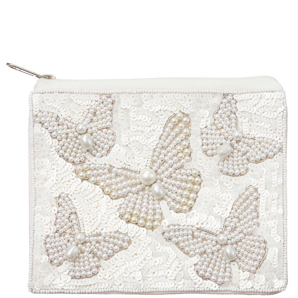 This SEED BEAD BUTTERFLY SEQUIN COIN POUCH BAG is the perfect accessory for those who love all things pretty and fun. The delicate butterfly design and sparkling sequins add a touch of whimsy to this white coin pouch. Keep your belongings safe and stylish with this unique bag!