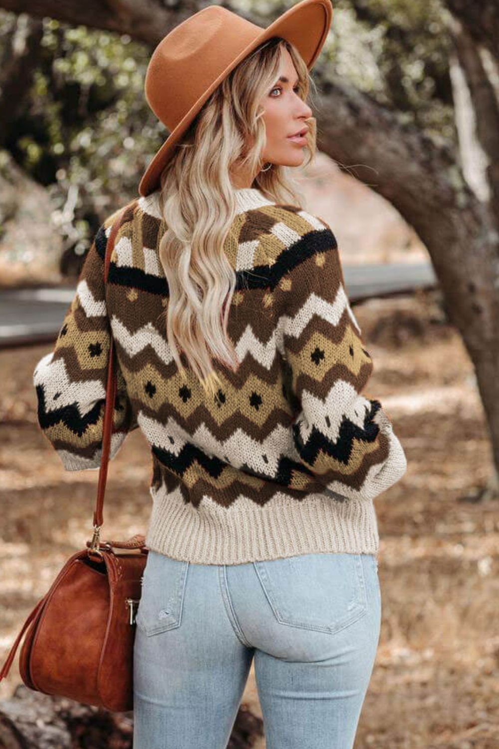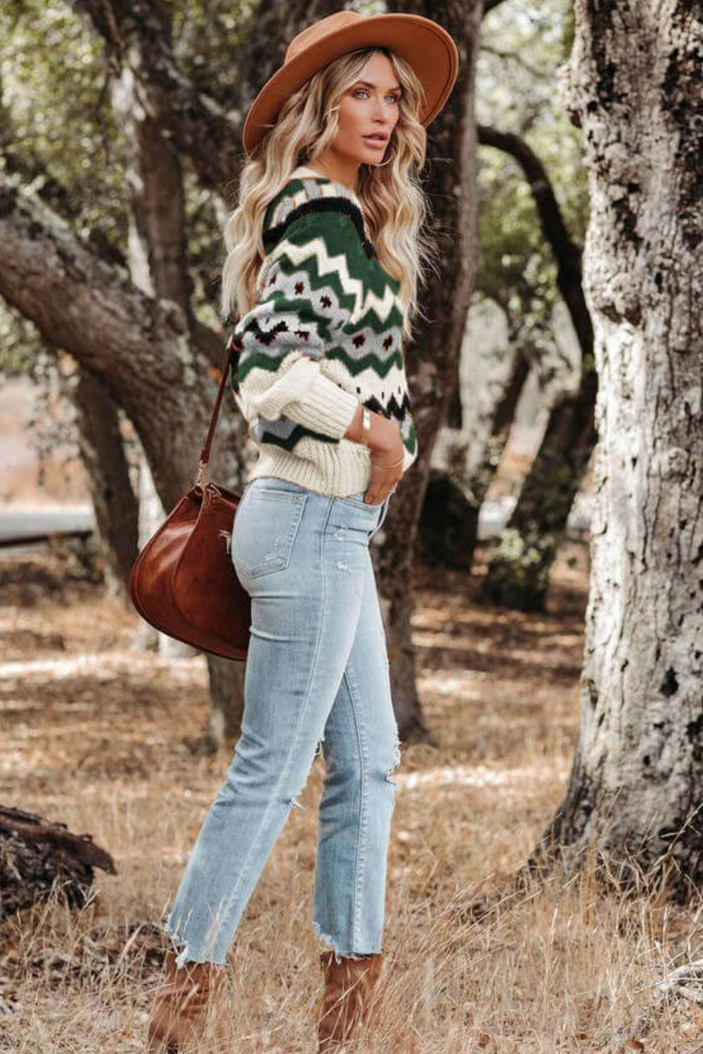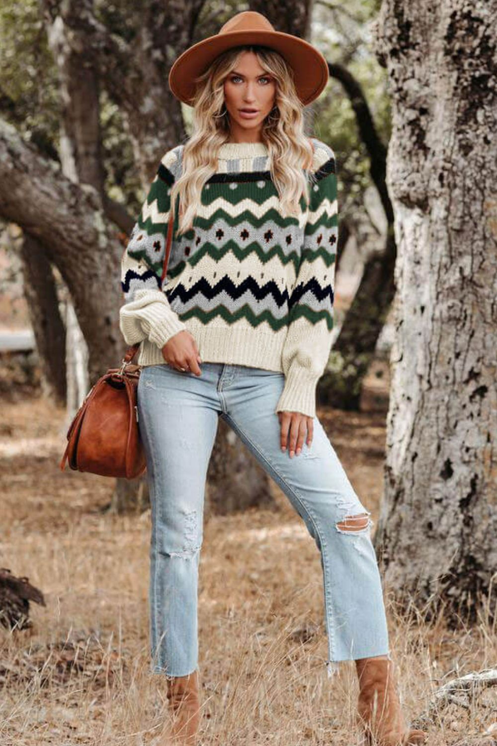 Printed Raglan Sleeve Ribbed Trim Sweater-Online Exclusive