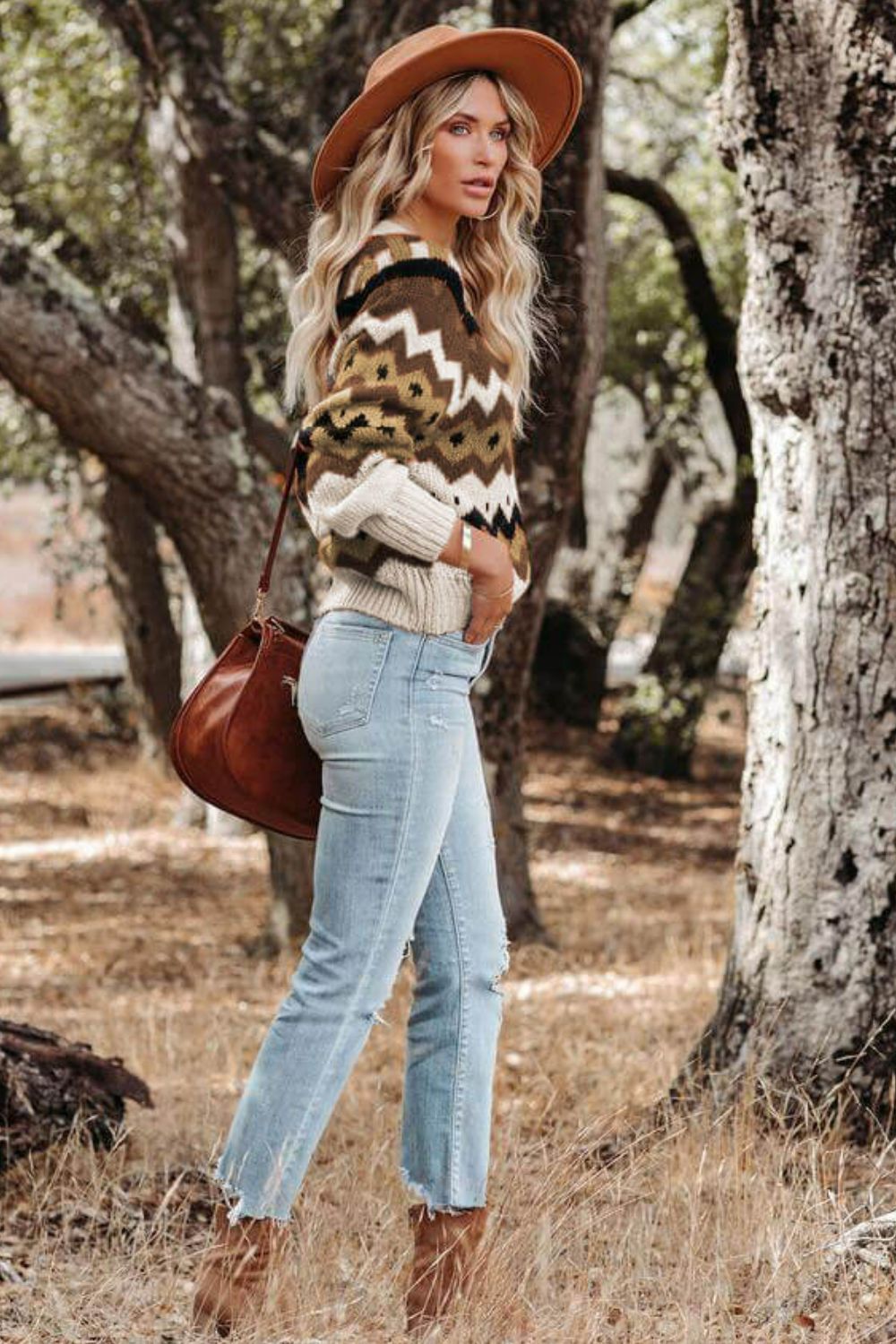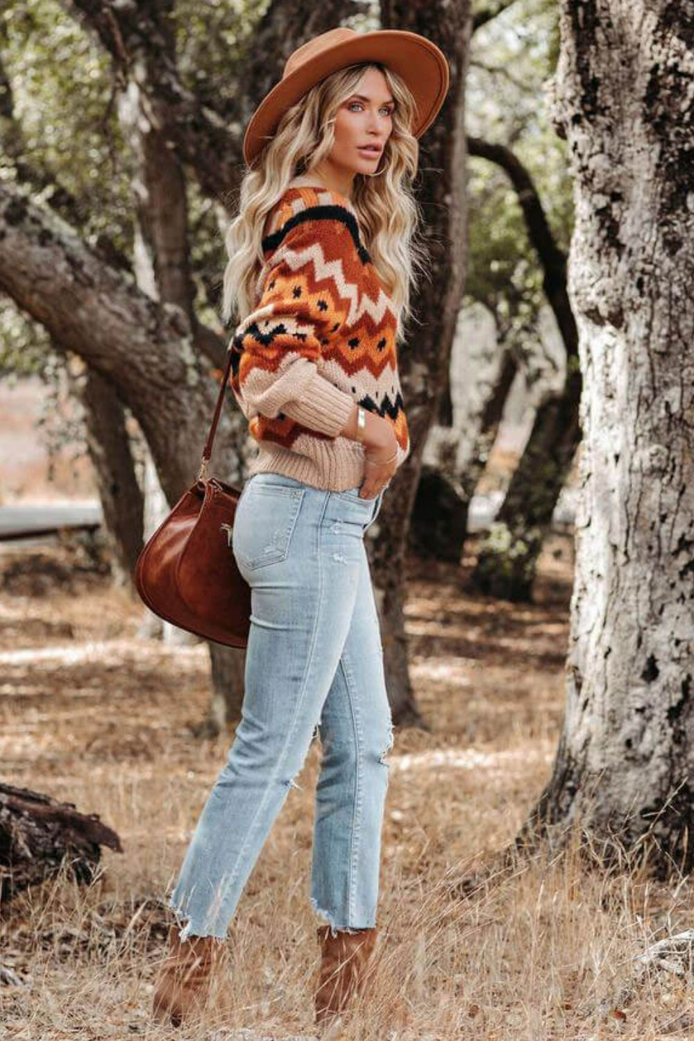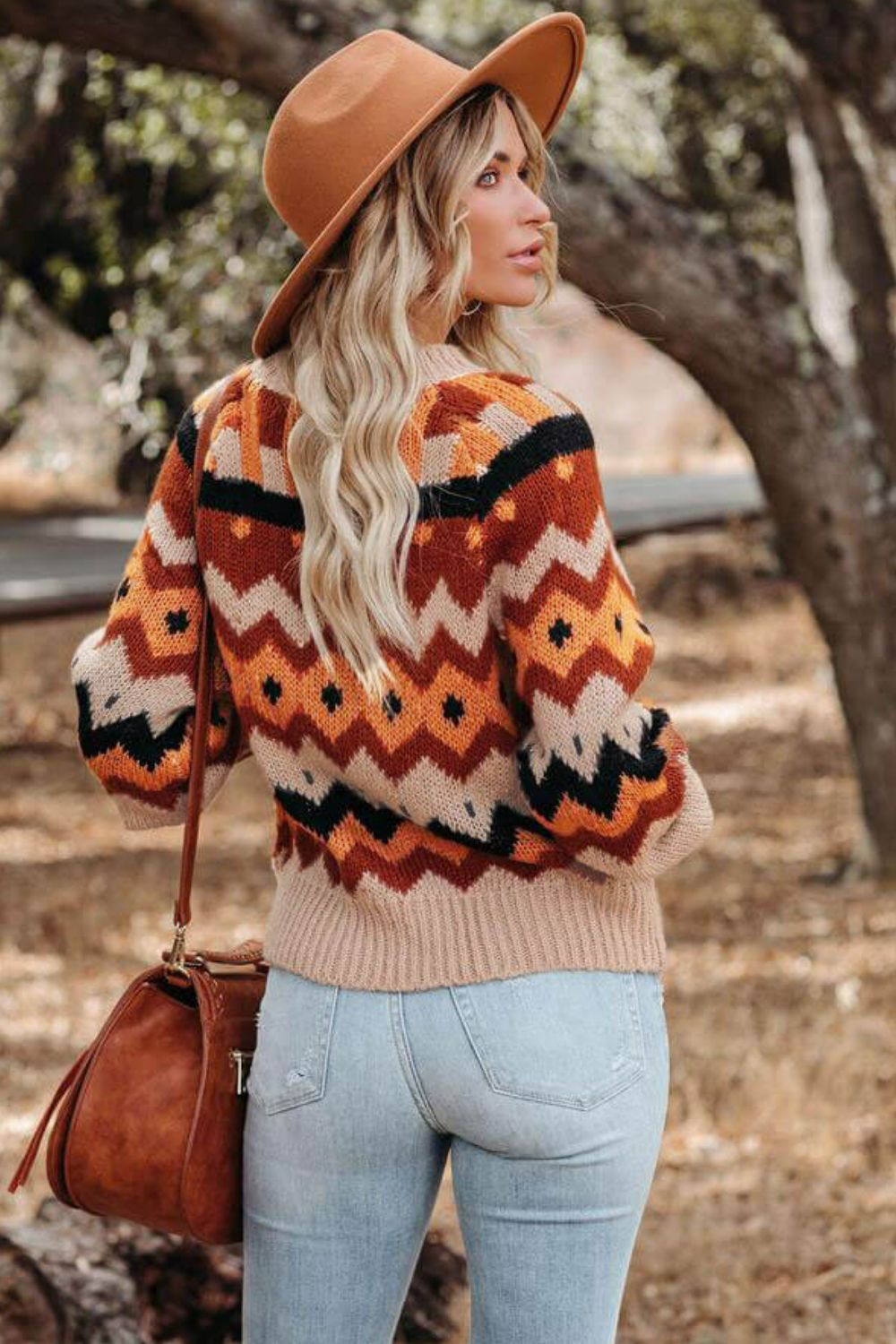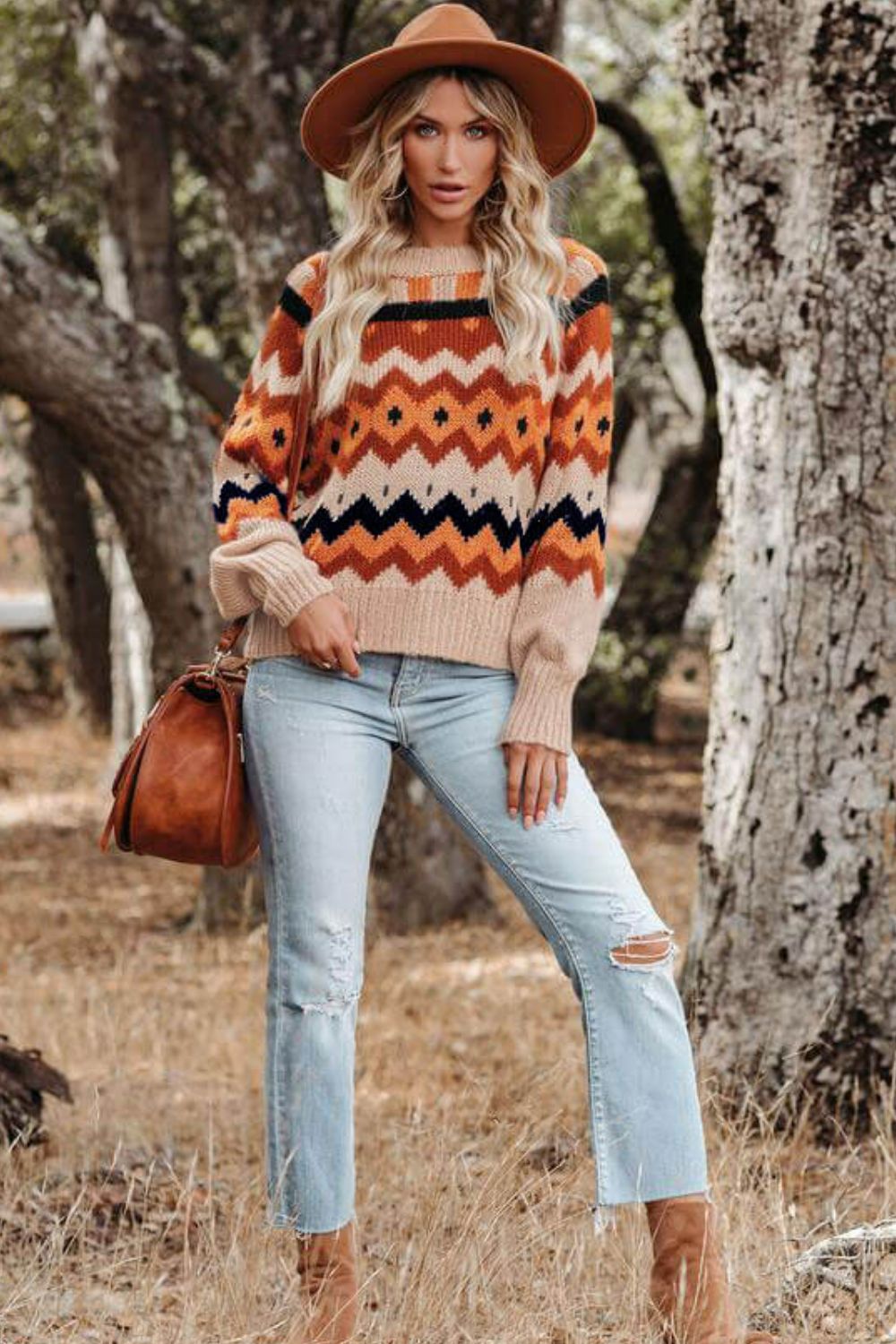 Printed Raglan Sleeve Ribbed Trim Sweater-Online Exclusive