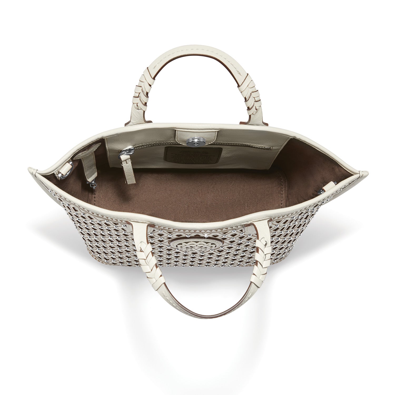 The La Bellezza Collection continues to be inspired by the diamond shape patterns found on facades of Venice, Italy Gothic style architecture. The lasered parts of the mini tote are digitally printed with a matching leather color behind the front panel.