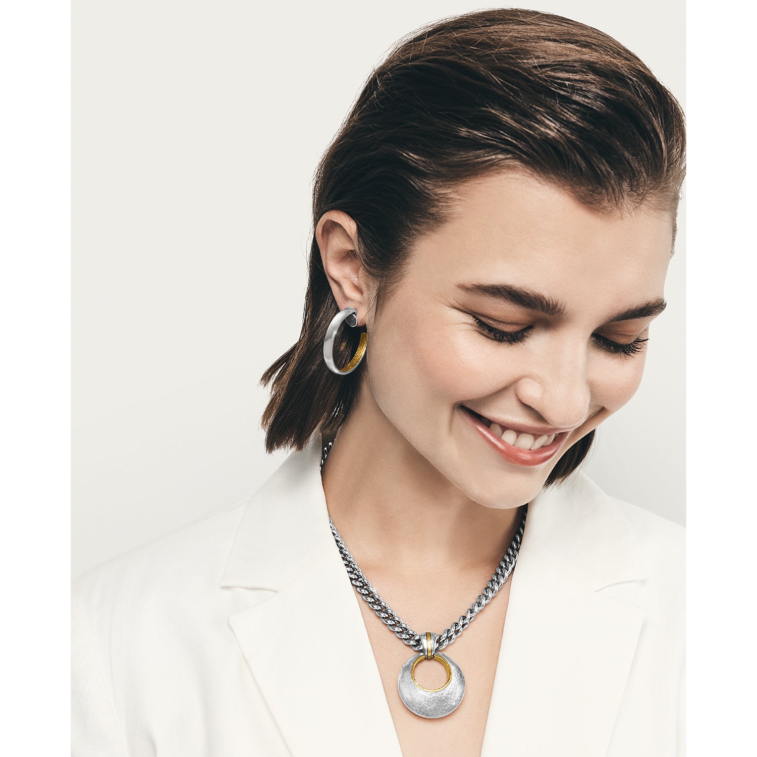 These hoop earrings with softly hammered details and golden accents is modern art-to-wear – breathtaking from every perspective.