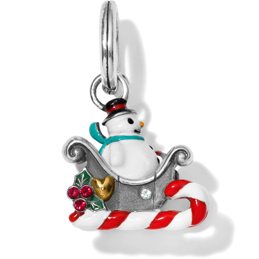 This hand enameled snowman sits in his candy cane sleigh, ready to add a festive touch to your charm jewelry.