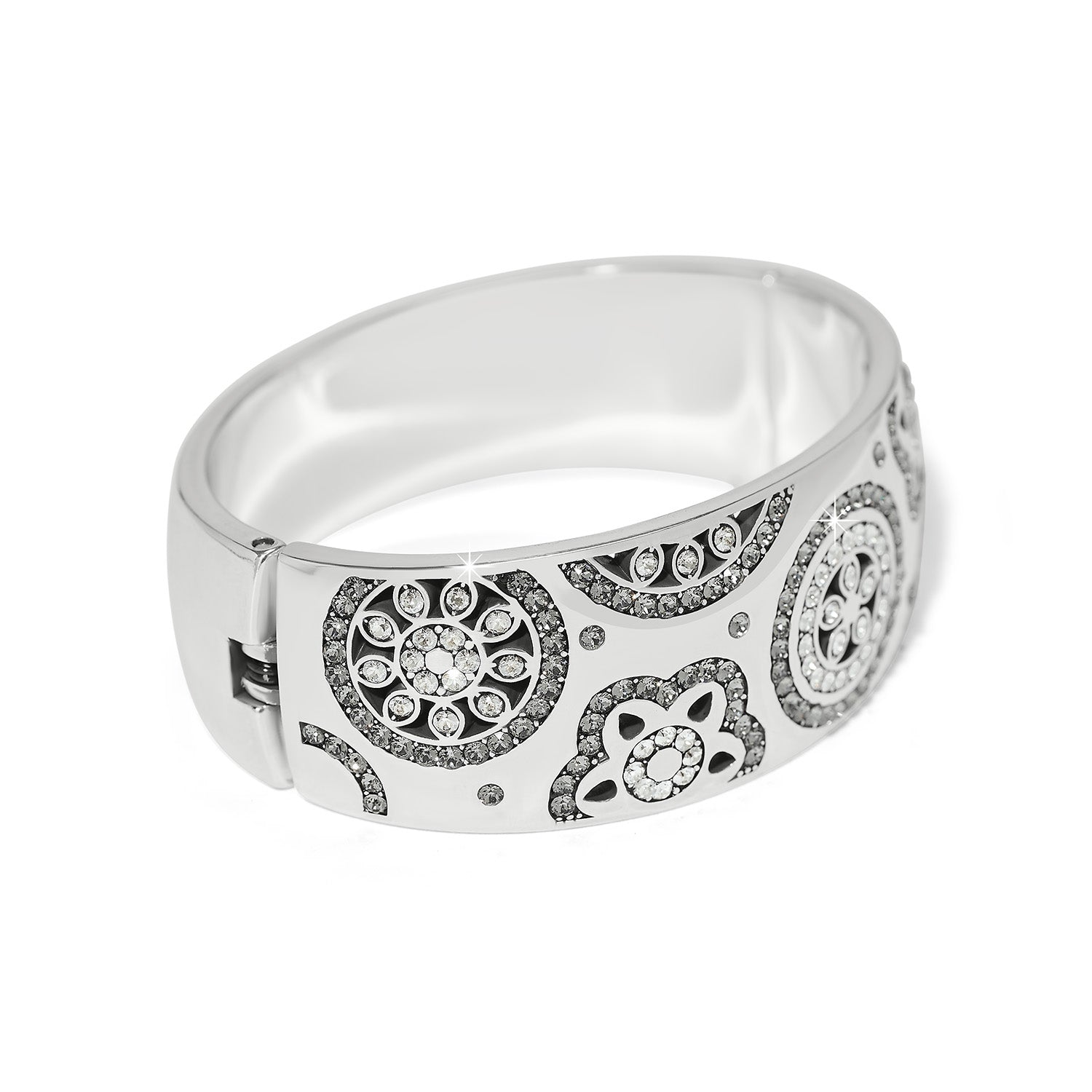 Mid-century floral patterns were the muse for this pave crystal hinged bangle defined by black diamond-hued accents.