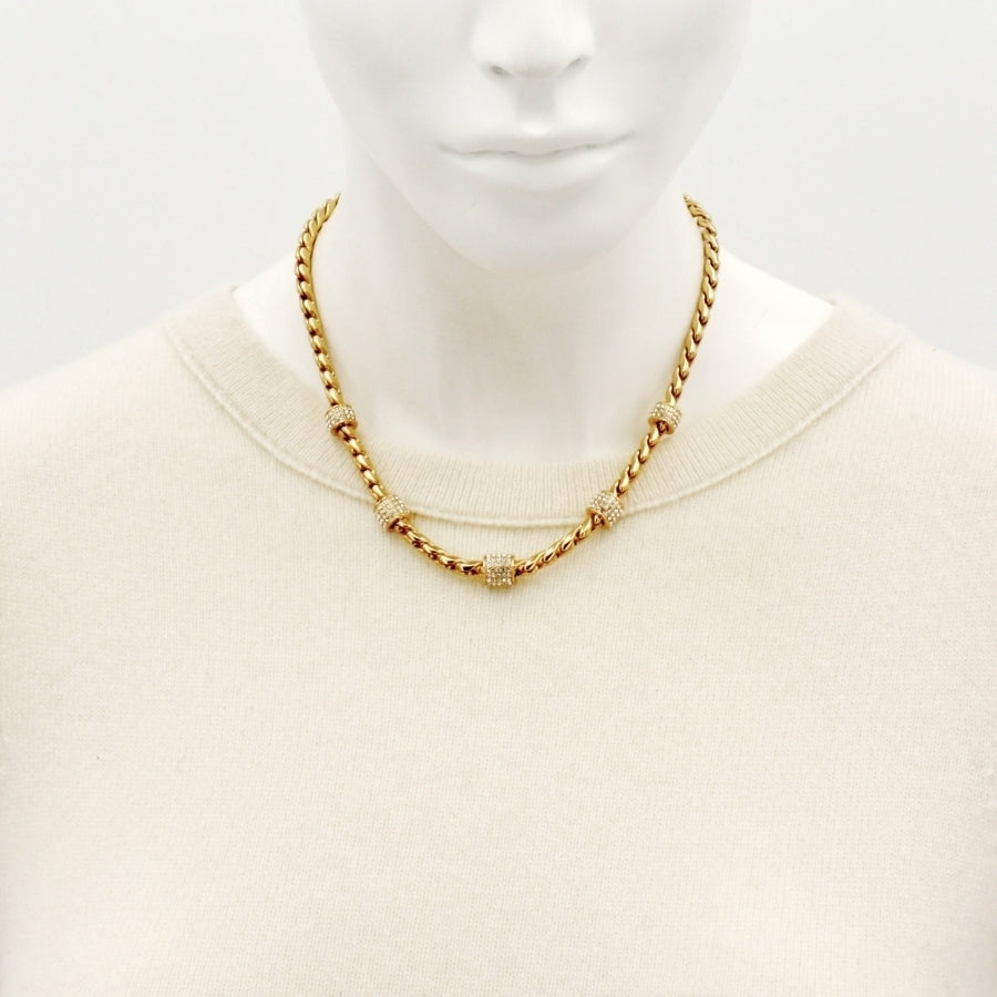 Inspired by the imaginary arc of the earth, this twisted rope curves around the neckline in the same fantastic way, stopping only for admiration of each graduated crystal station.