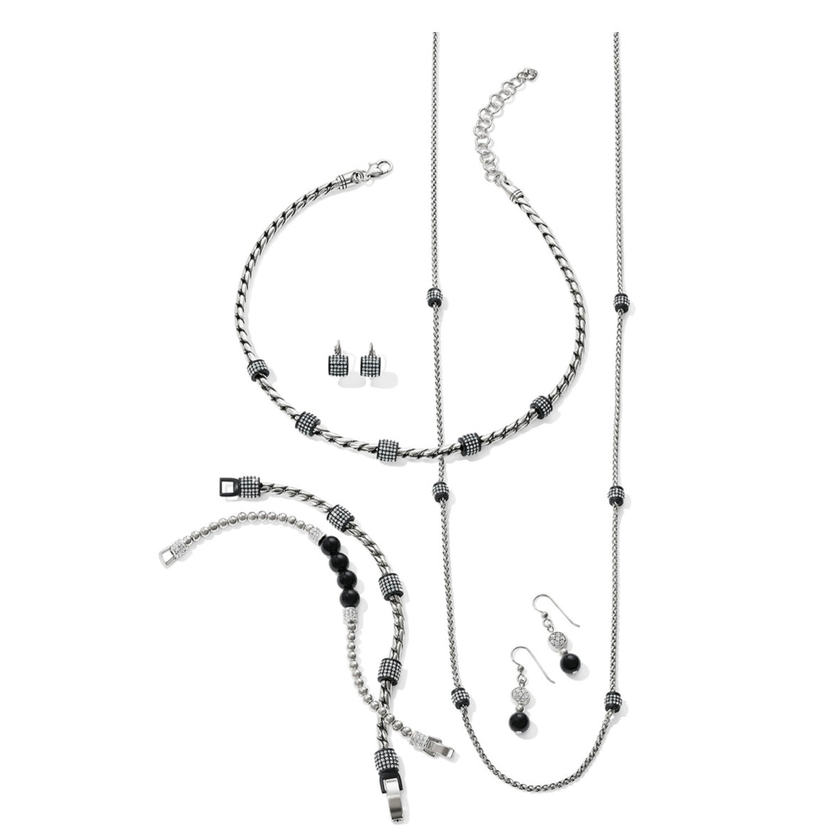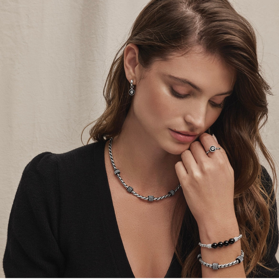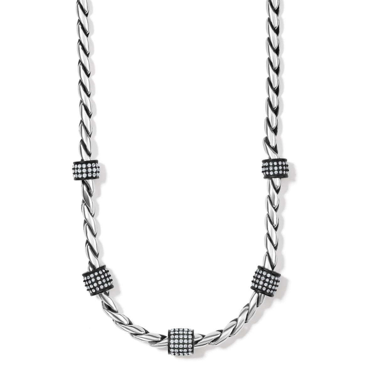 A touch of black on each barrel station of pave Swarovski lends warmth to this fine jewelry-like collection. Wear this necklace and expect compliments.