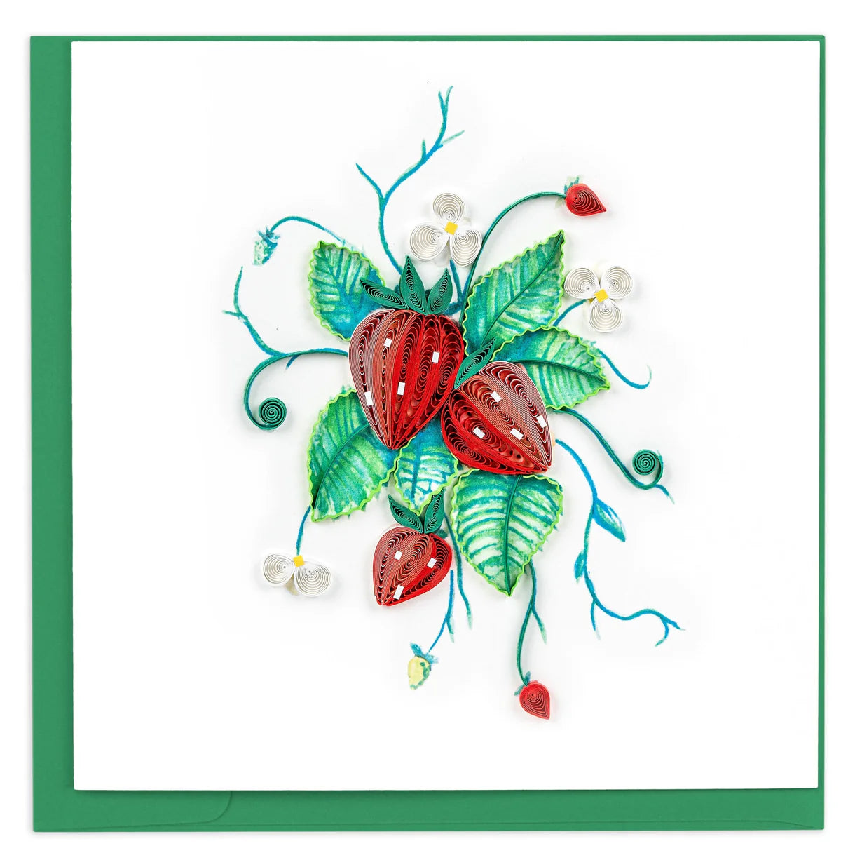 Delight in the charm of nature with this quilled greeting card showcasing wild strawberries. Handcrafted with intricate detail, the vibrant red berries and lush green leaves create a stunning design. Perfect for any occasion, this card is a beautiful way to share your heartfelt messages.