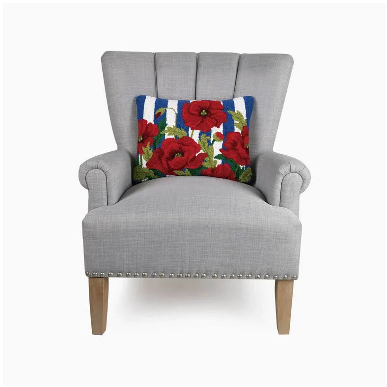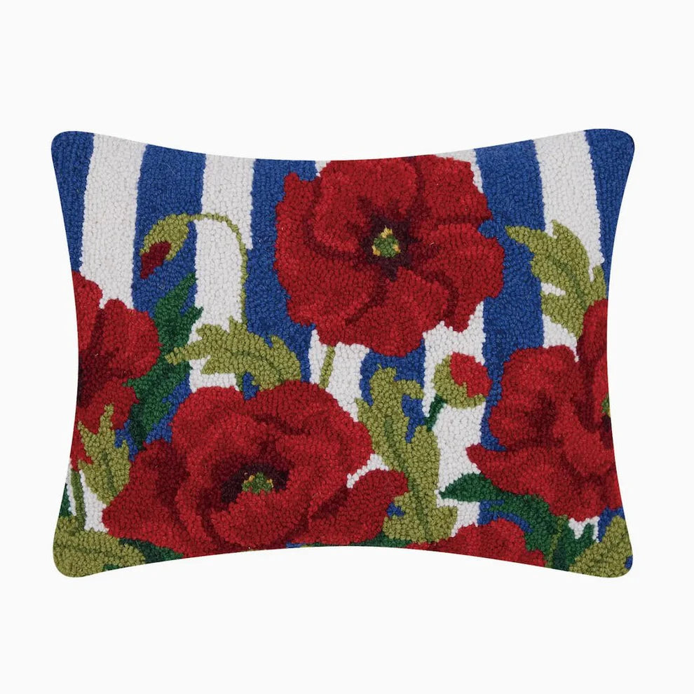 This gorgeous 14 x 18” hooked rug pillow is perfect for your summer decor, especially at Memorial Day and July 4th! Made from 100% wool on the front and cream colored velveteen on the back side it features blue stripes and bright red poppies. A wonderful summer accent!