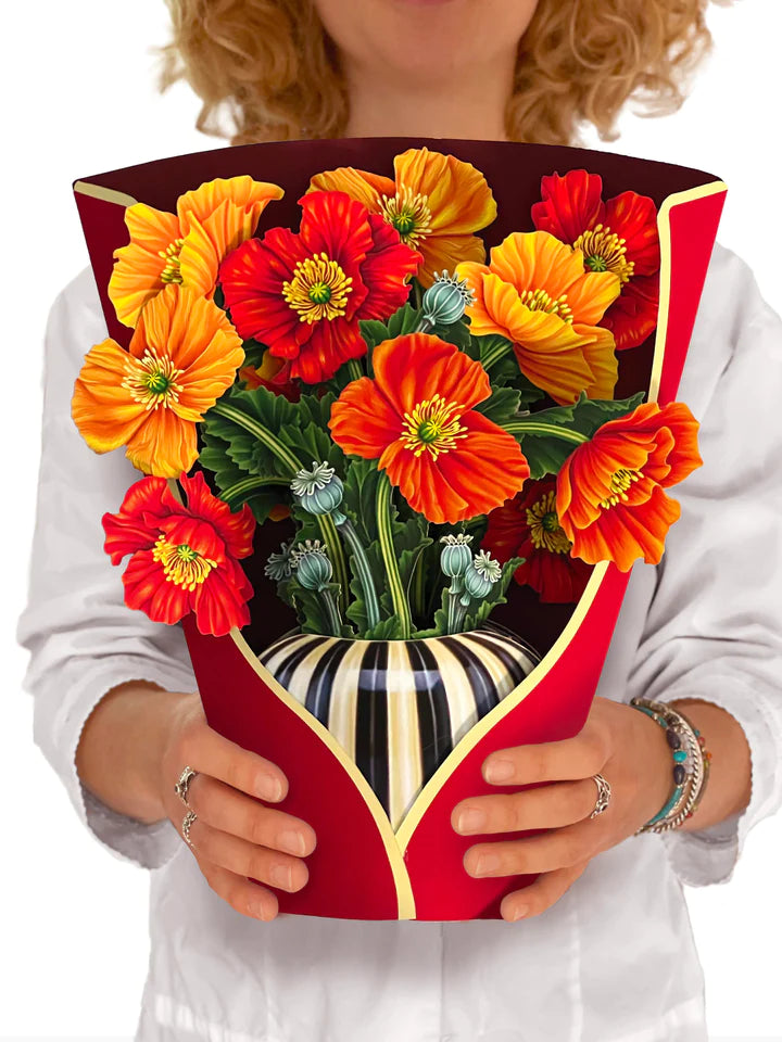 Glistening with hues of tangerine, copper, and ruby reds the poppy is symbolic of peace, remembrance, and luxury. Displayed in a stylish striped vessel, this bouquet is perfect for the unique and creative people in your life.