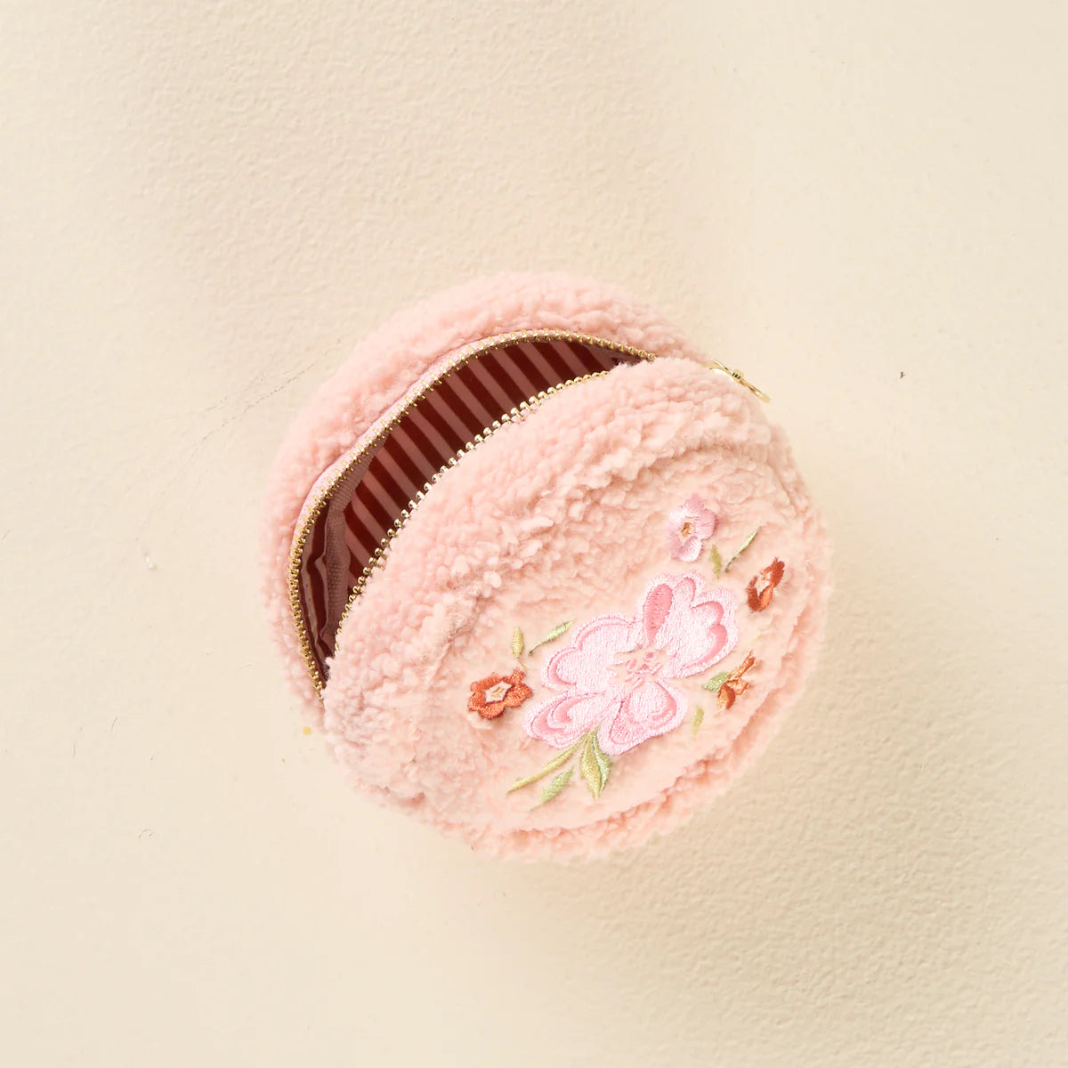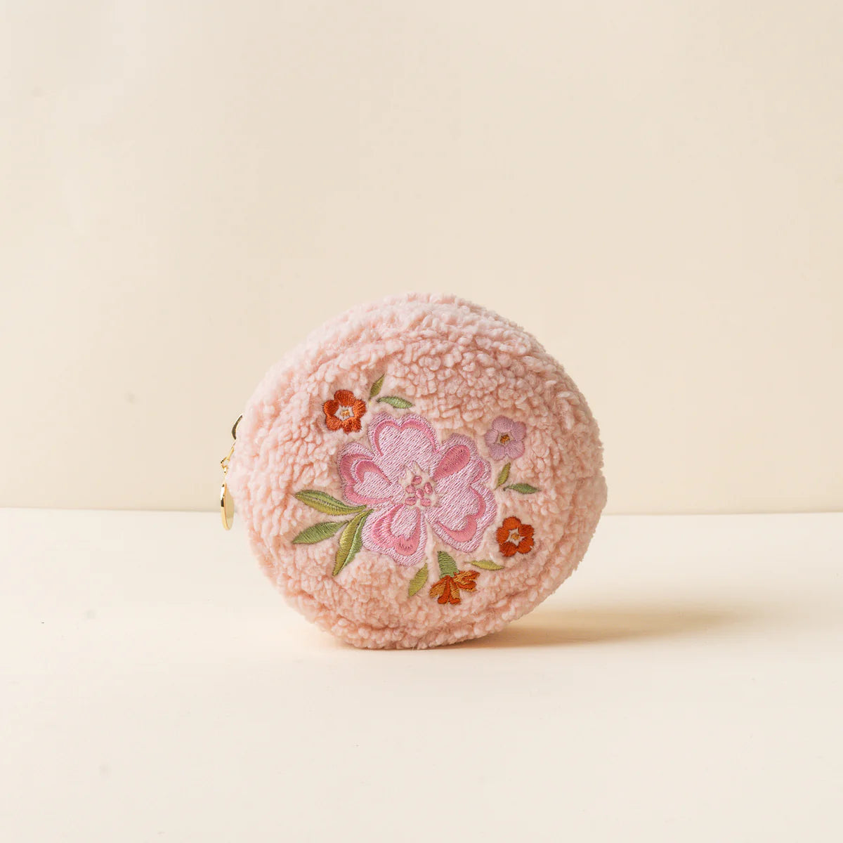 Add a cozy touch to your essentials with our Dainty Floral Pink teddy pouch. Crafted from soft sherpa fabric, this pouch features a wipeable lining for easy cleaning, and gold zippers and hardware for a polished look. The interior is lined with a fun printed fabric, making it as stylish on the inside as it is on the outside. A perfect size for keeping your favorite items organized, and can be beautifully paired with our other teddy pouch sizes to create a matching set.
