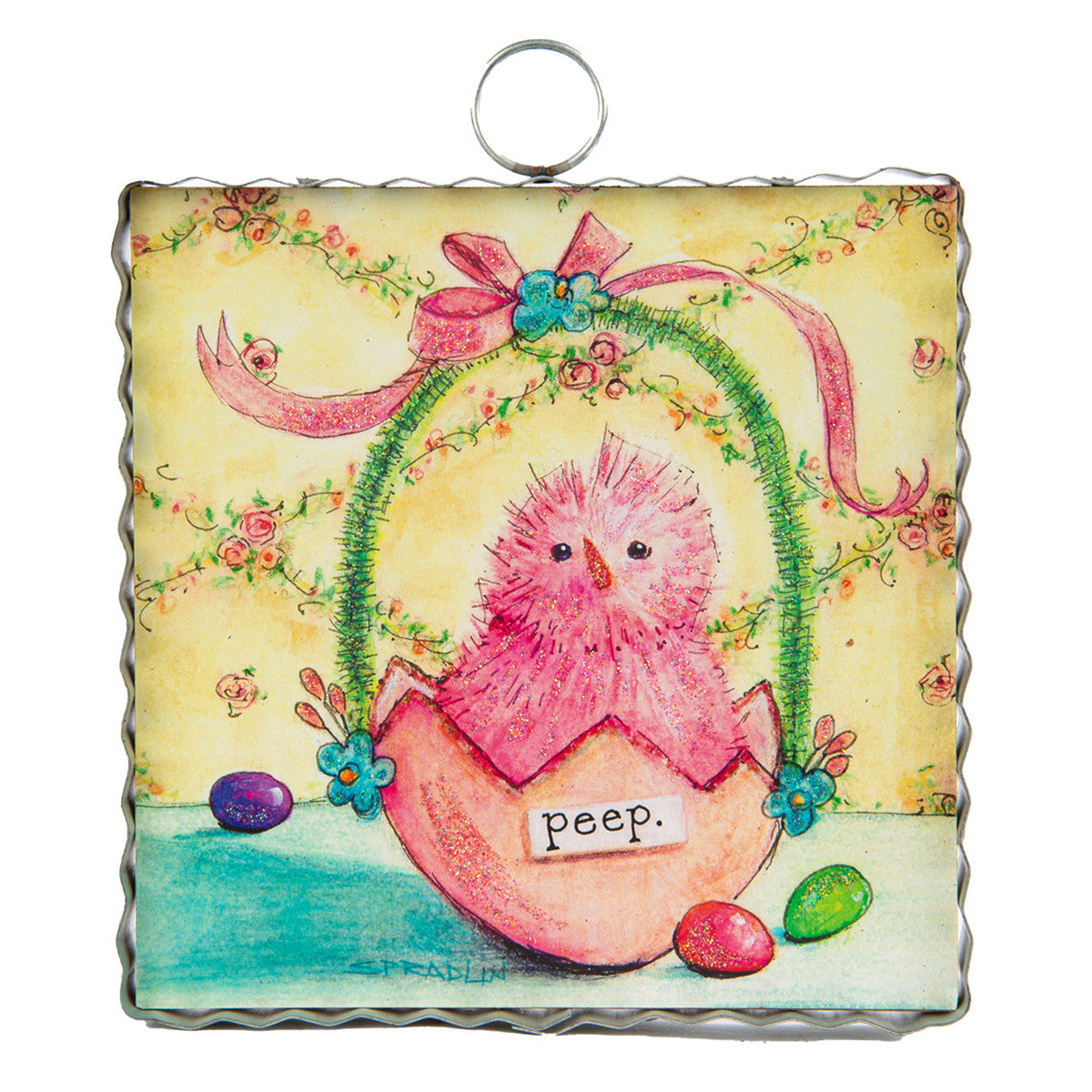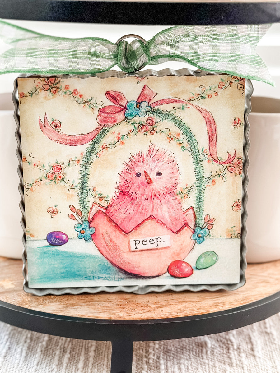 "Add some spring cheer to your home with the Mini Pink Chick Print! This playful decoration features a cute peep chick surrounded by colorful Easter eggs, perfect for your Easter basket or home decor. It's the perfect quirky touch to celebrate the season!"
