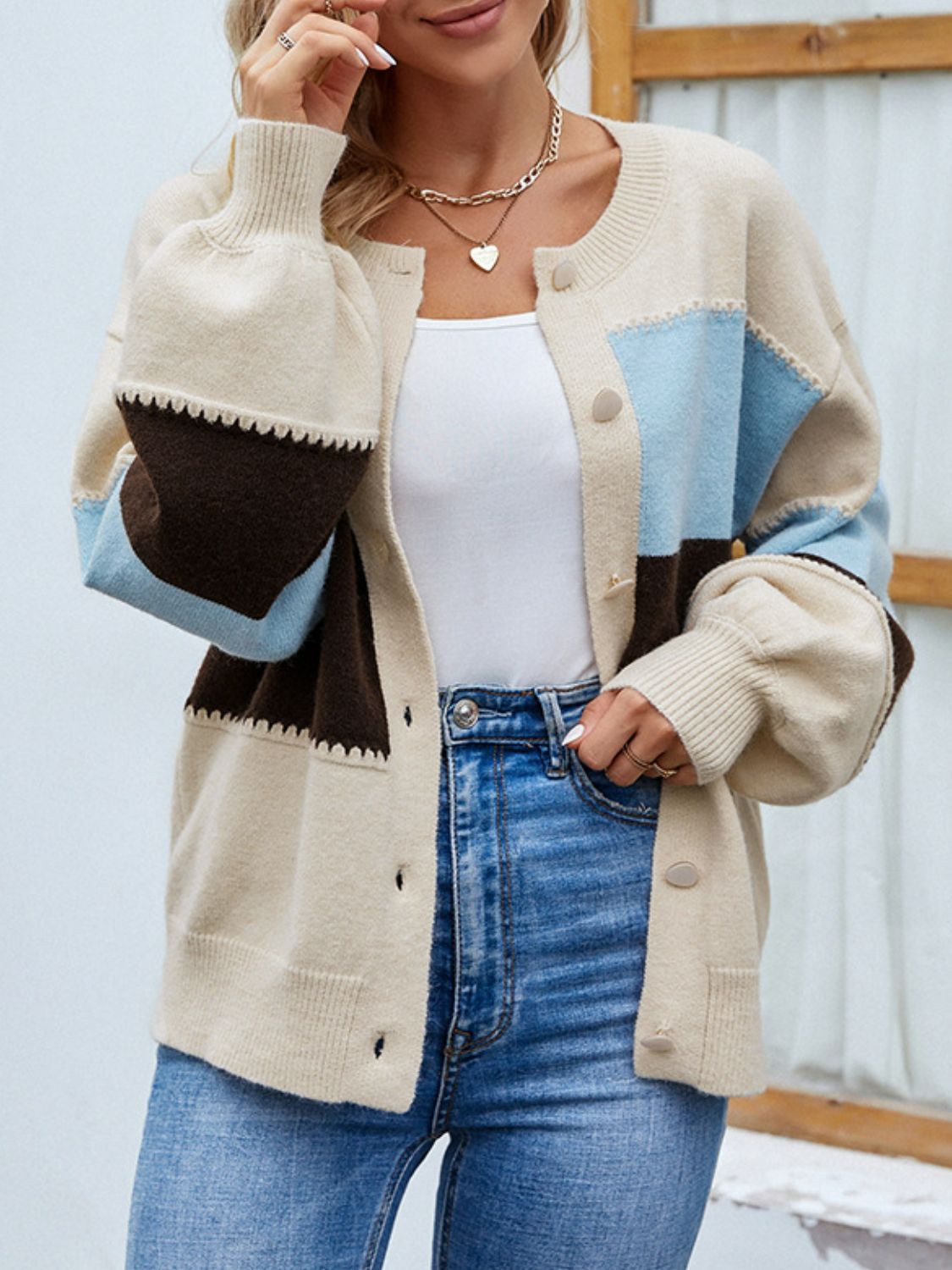 Color Block Lantern Sleeve Button Down Cardigan-Online Exclusive