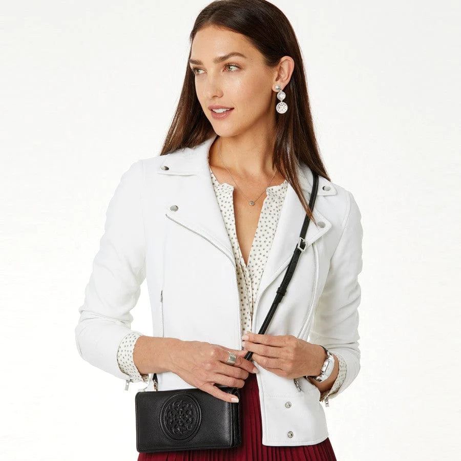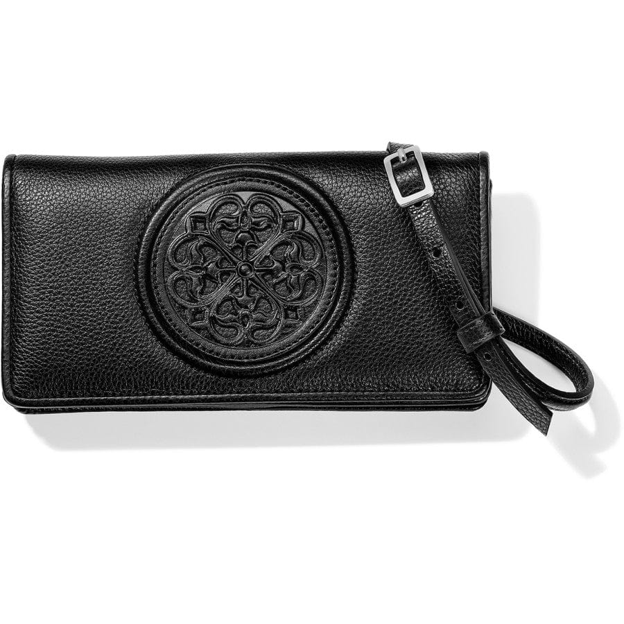 Transition from desk to dinner with this wallet and crossbody in one. Featuring our iconic Ferrara medallion on its front, in black on black leather, the look is stunning. The strap is also detachable!