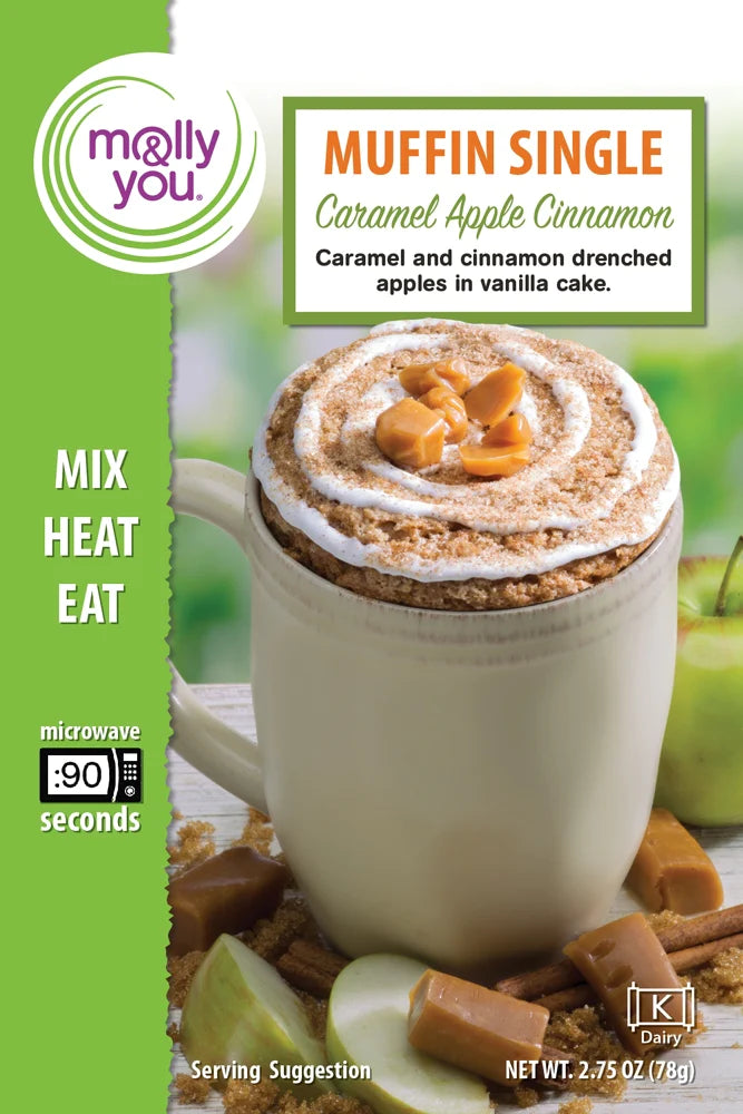 Caramel and cinnamon drenched apples in vanilla cake. Just add water, stir and microwave.