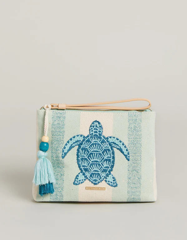 A beautiful stripe pattern and Sea Turtle embroidery is just the beginning to our thick, durable cotton canvas Carina Wristlet, which features a faux leather wristlet strap, an easy, zip-top opening, a tiered tassel, plus an interior zip pocket.