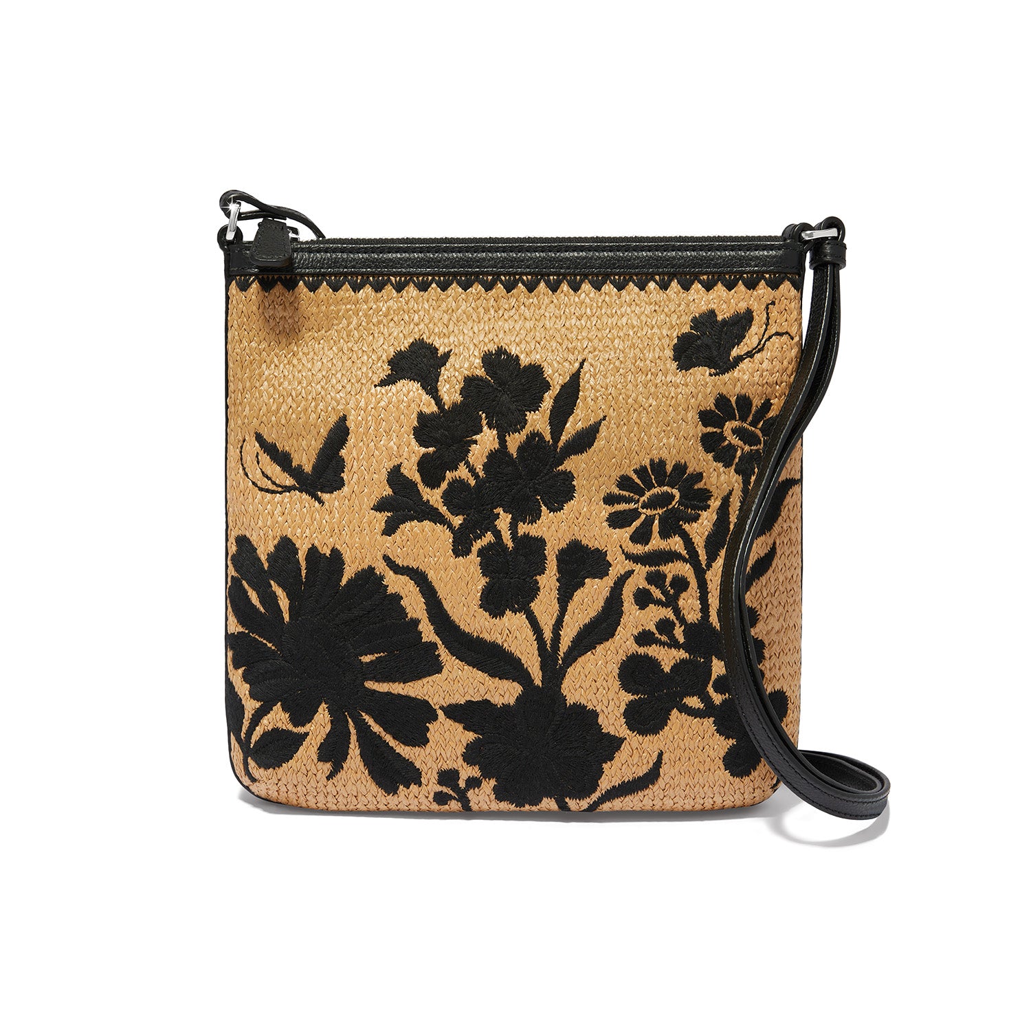 Two beautiful textures come together in this refreshing bag with a straw-like basket weave that is then embroidered with 50,000 stitches of floral artwork in a super wardrobe-friendly style.