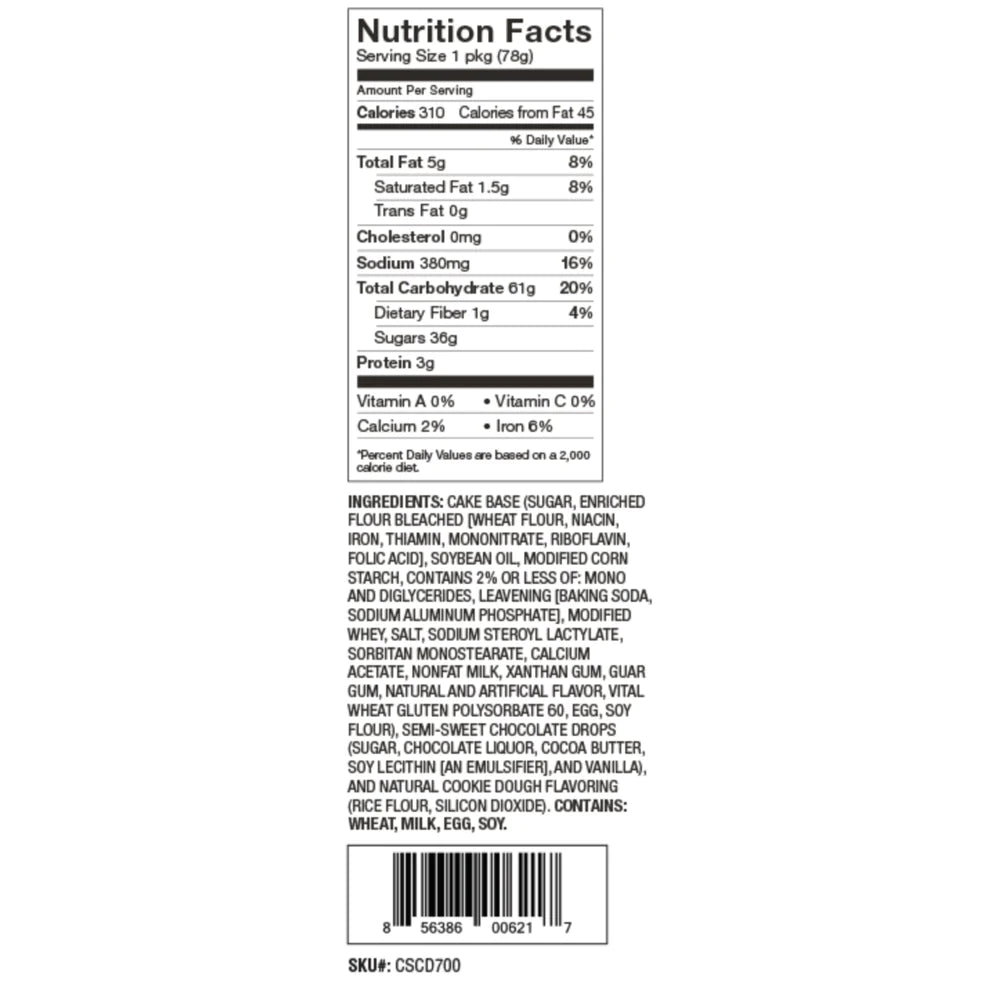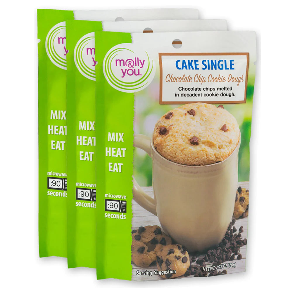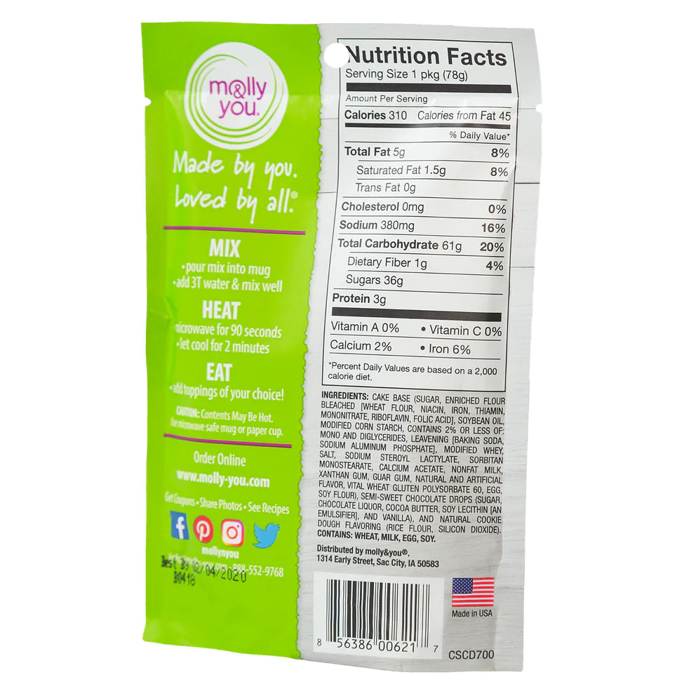 Chocolate chips melted in a decadent cookie dough mug cake. Just add water, stir and microwave.