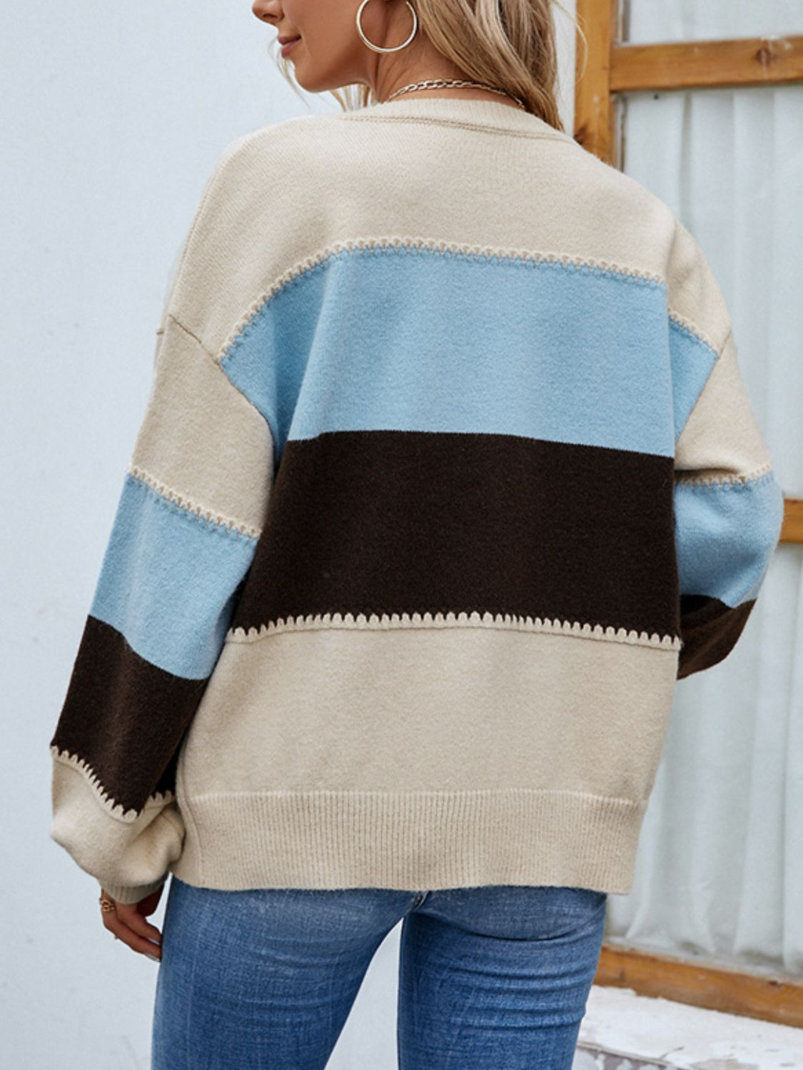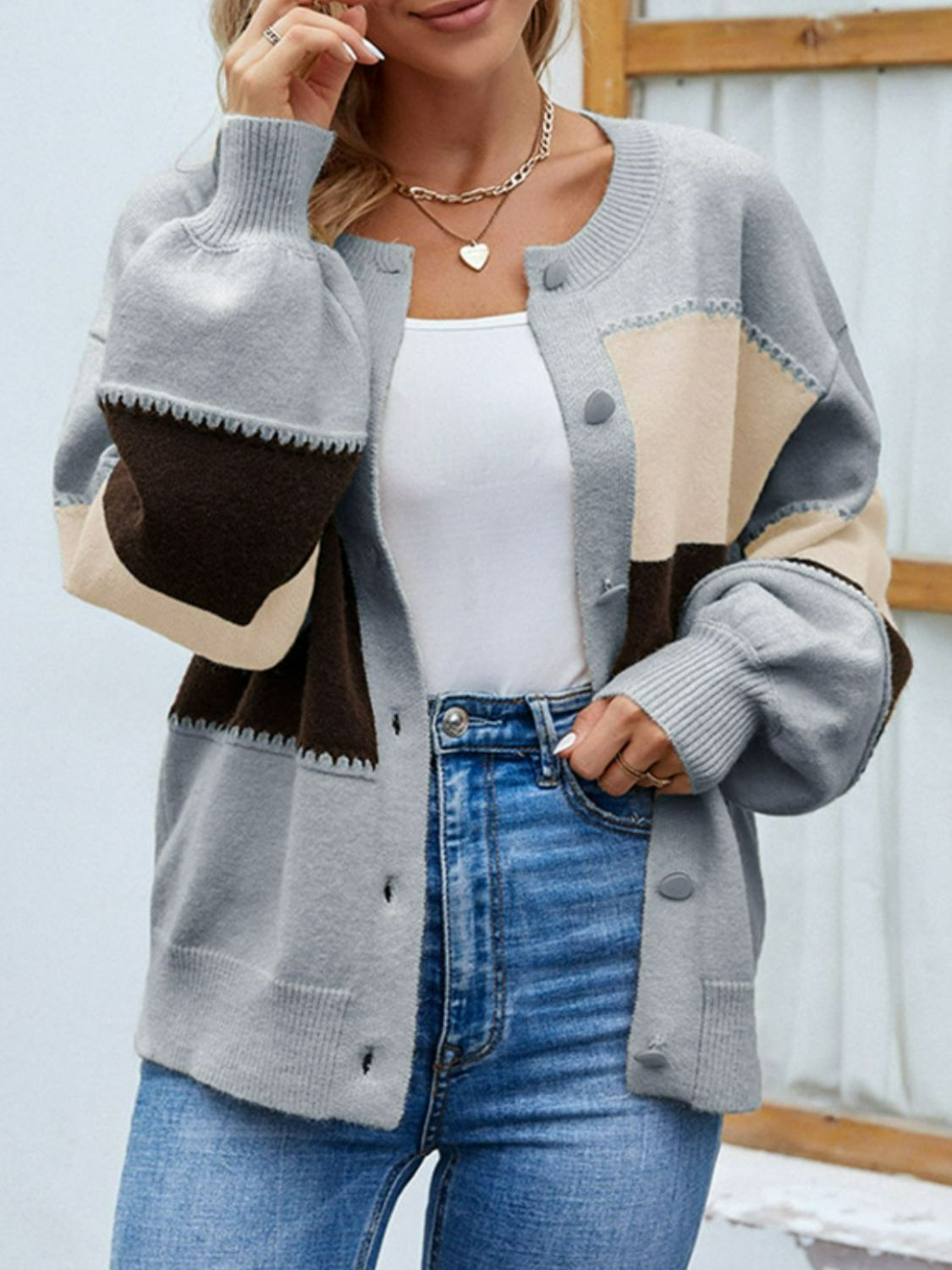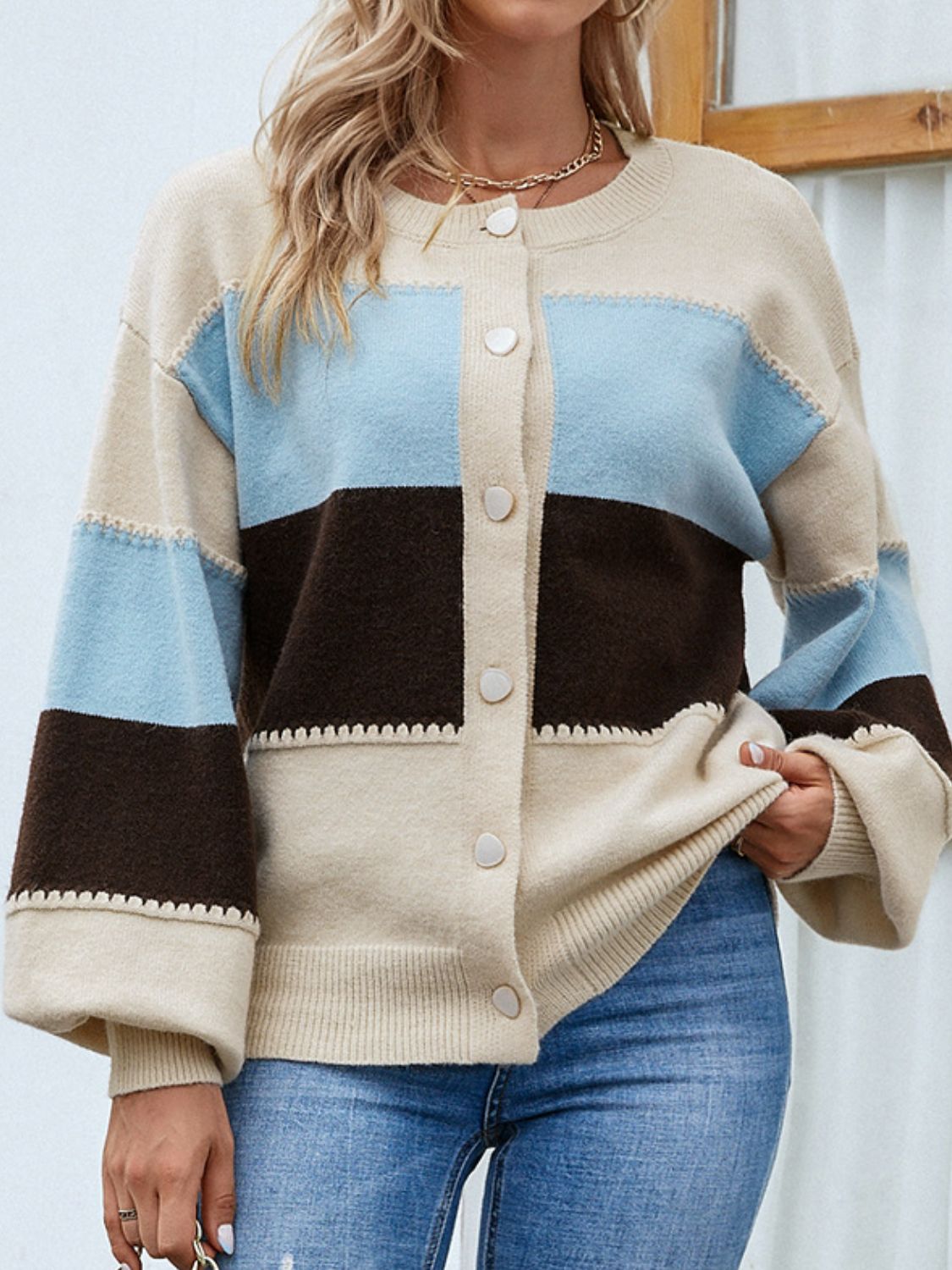 Color Block Lantern Sleeve Button Down Cardigan-Online Exclusive