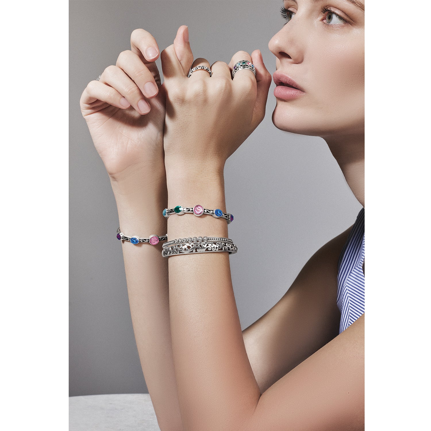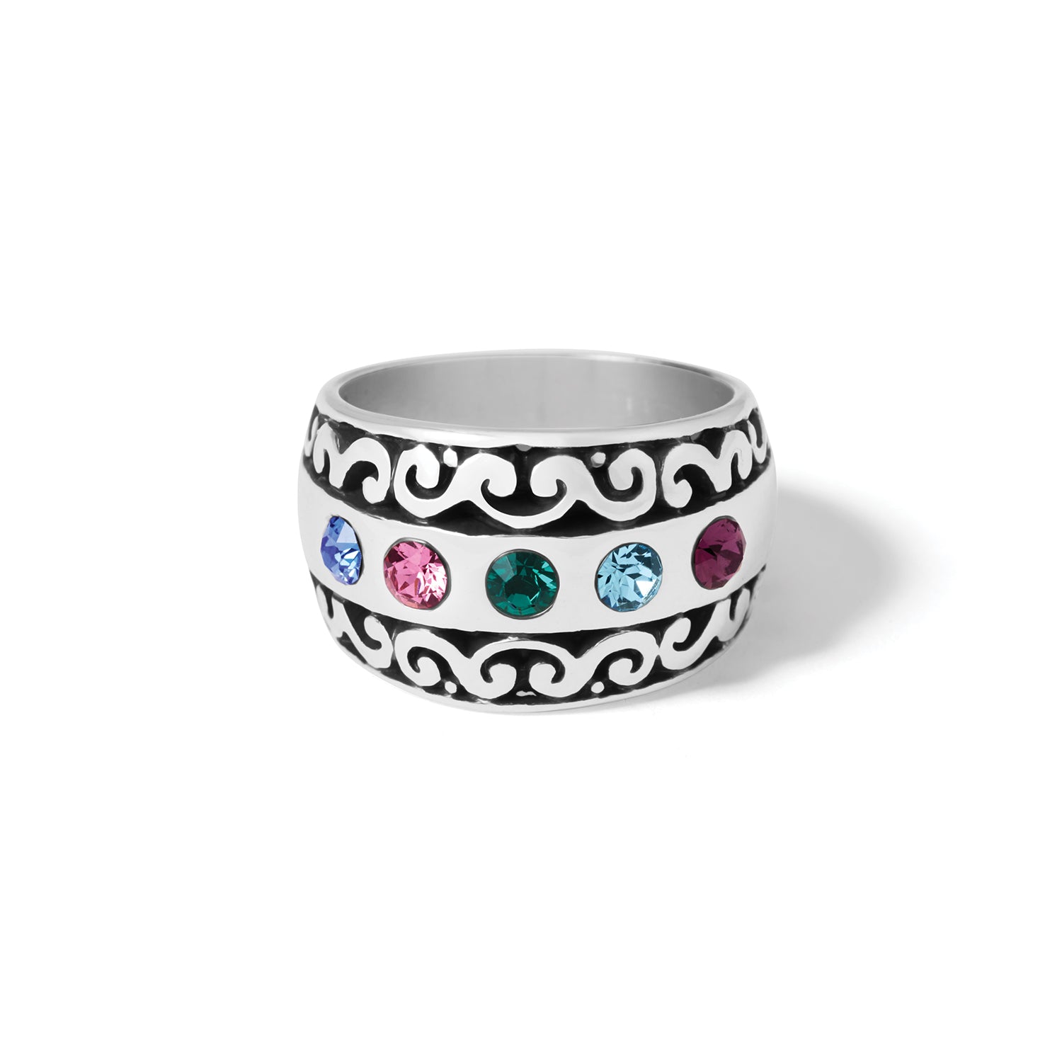 Hand-set fine crystals in beautiful hues add a colorful pop to this beautiful scrolled silver ring.