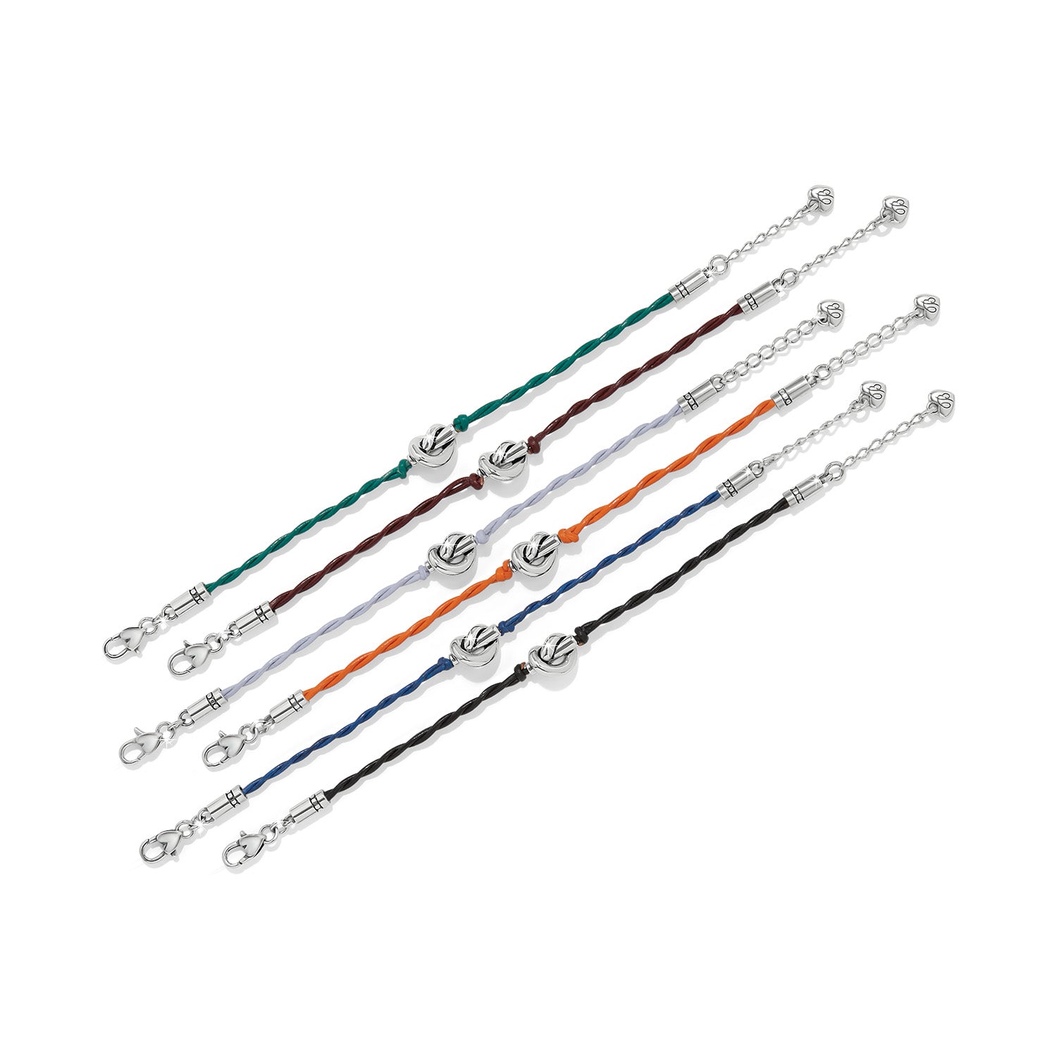 At the heart of petite leather twisted bracelets lies a silver sculptural knot. The knot, with its fluid interwoven form, draws the eye as it sits centered on a finely twisted leather strap. The twisted leather adds a playful contrast to the silver metal centerpiece.