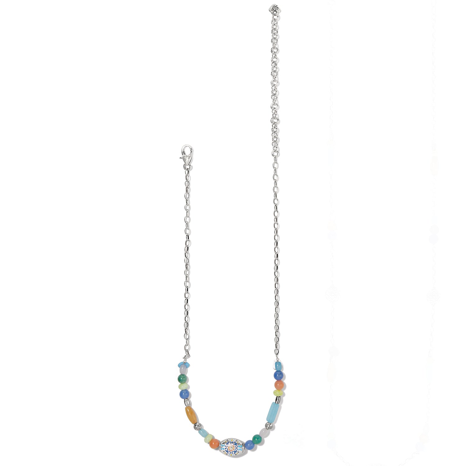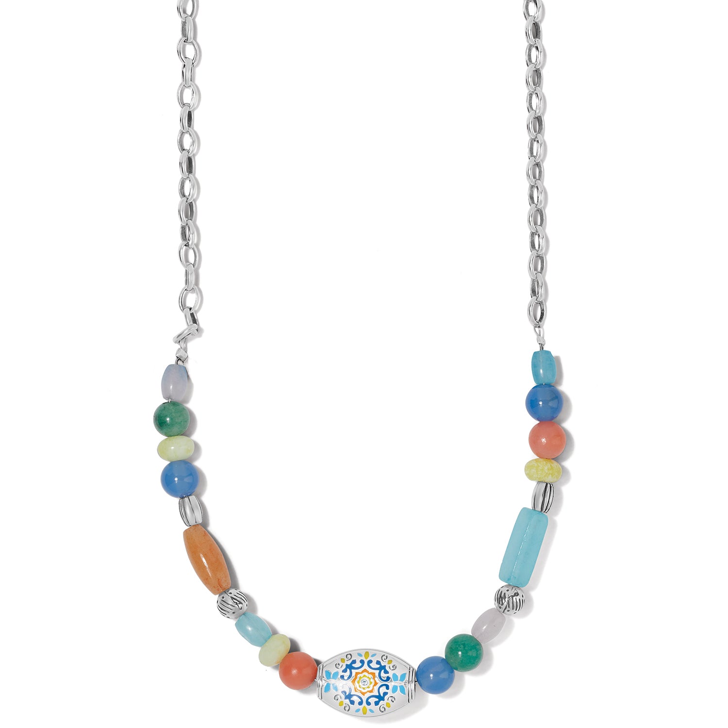 Named for the word “butterfly” in Italian, this short necklace features blue, orange and lemon hues for a zesty and fun-loving feel as well as an artful vibe, plus semi-precious stone beads, accents of handset crystals and hand-painted enamel artisan detailing.