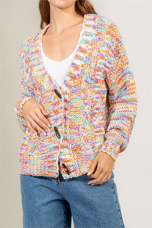 This multi-color cable knit sweater is accented with wooden button down front.