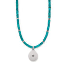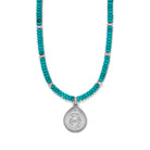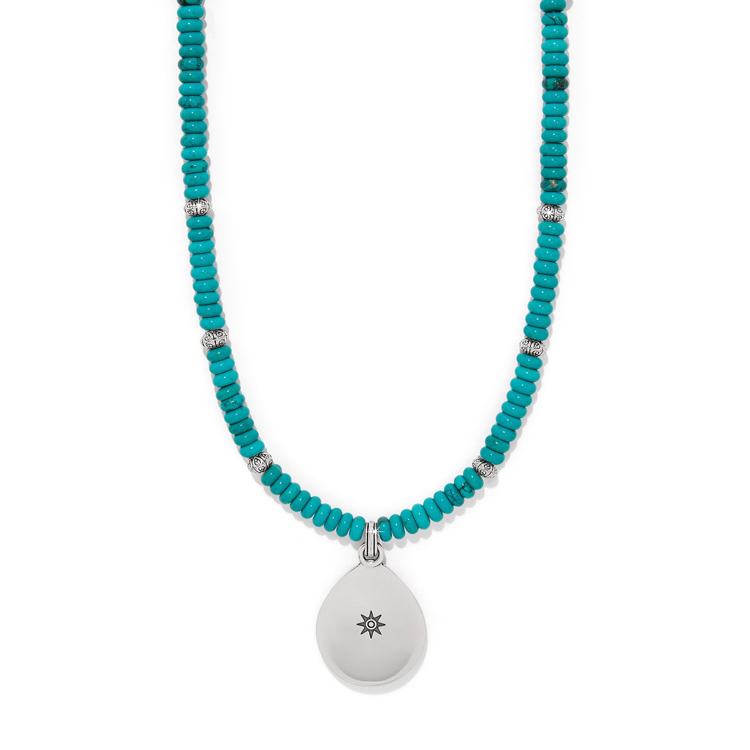 Inspired by the beauty of a vast sky, this necklace with artisan etchings and semi-precious turquoise-hued beads gives a southwest vibe to your style.