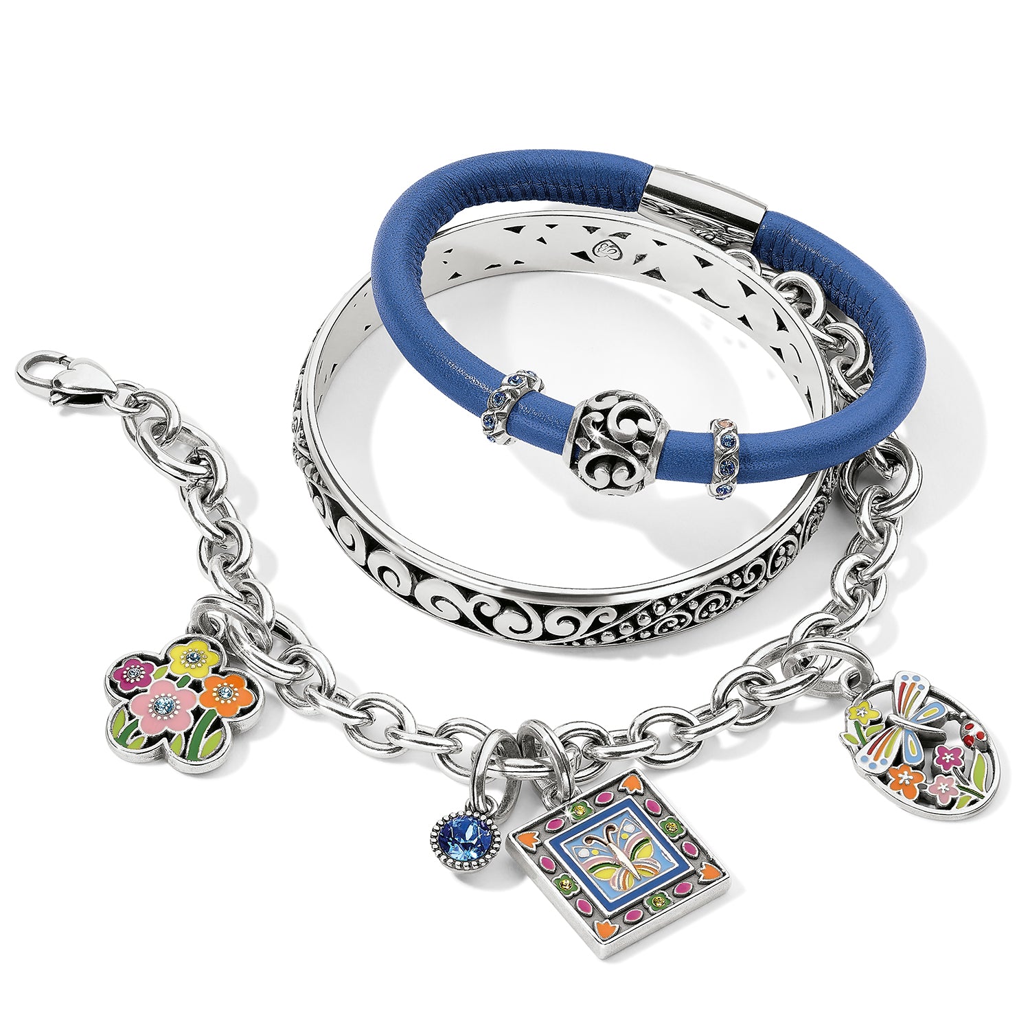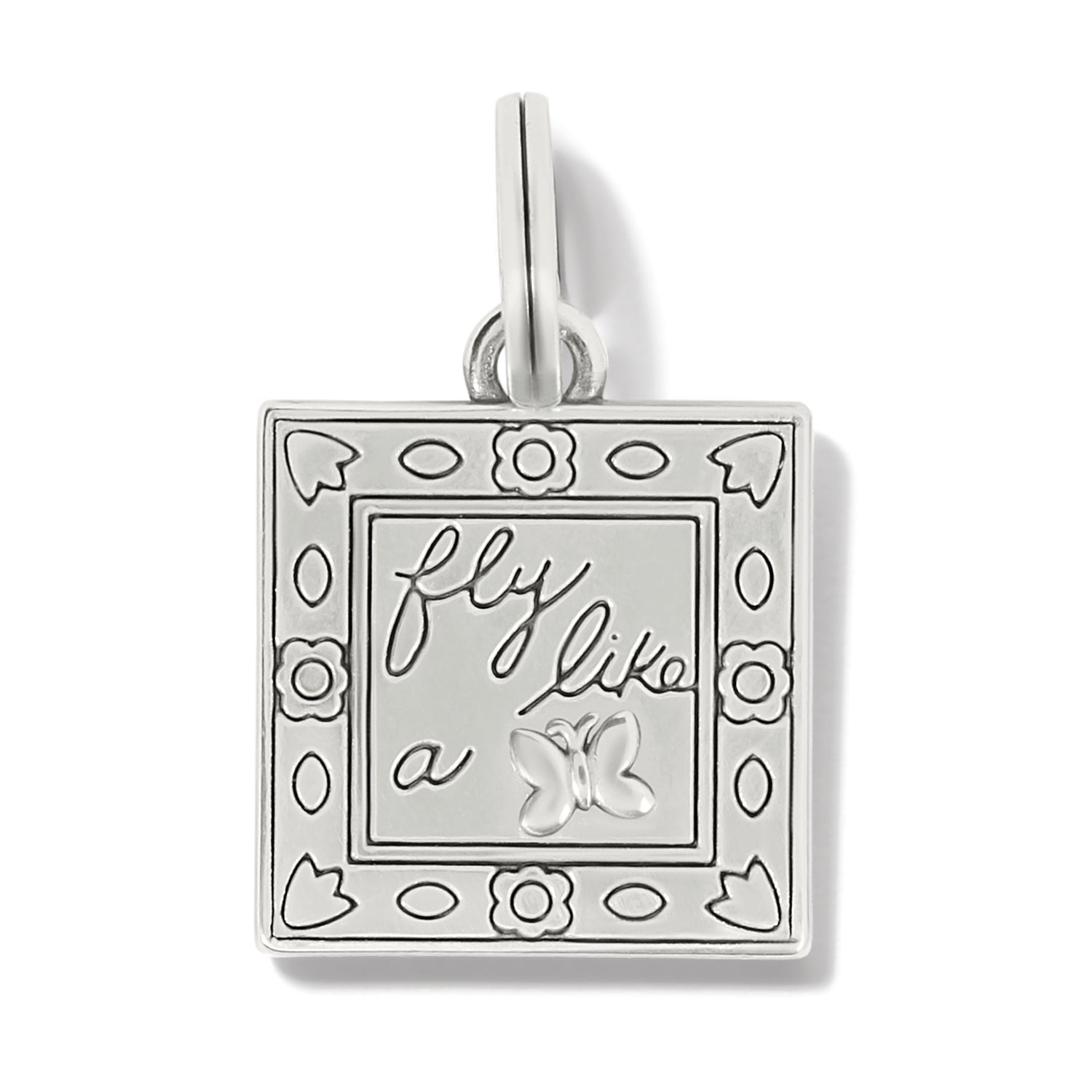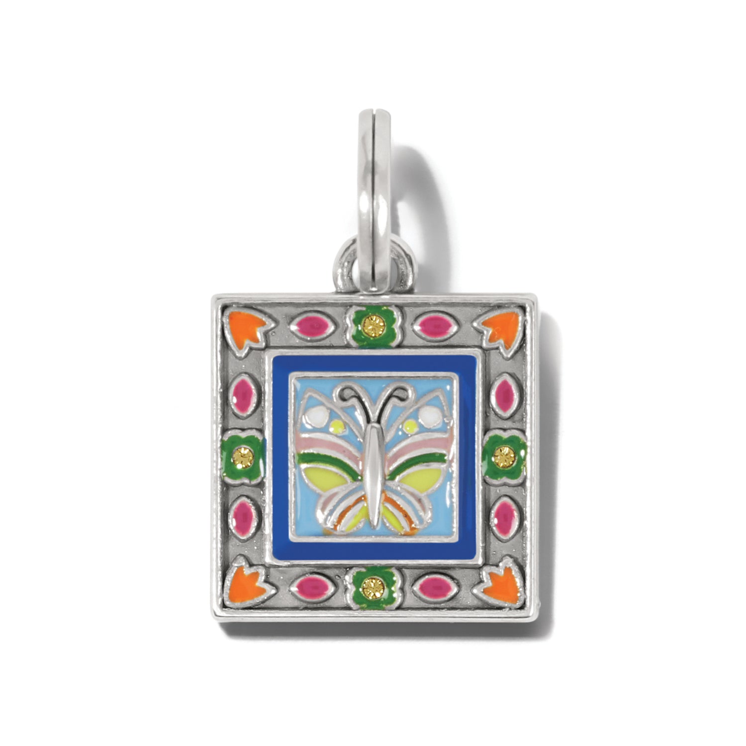An iconic symbol of spring, a butterfly spreads its wings inside a colorful frame on this artful, hand-enameled charm.
