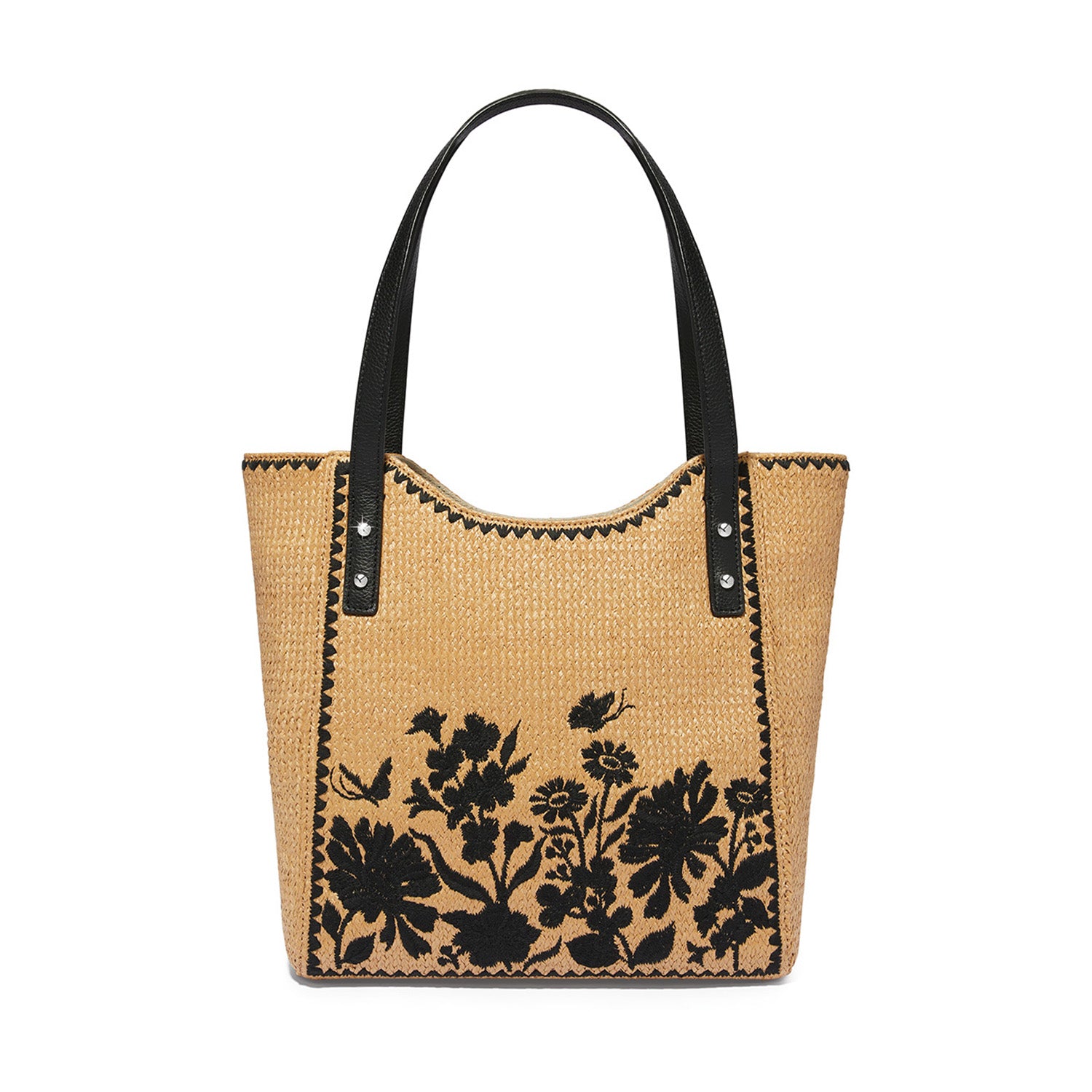 Two beautiful textures come together in this refreshing bag with a straw-like basket weave that is then embroidered with 50,000 stitches of floral artwork in a super wardrobe-friendly style.