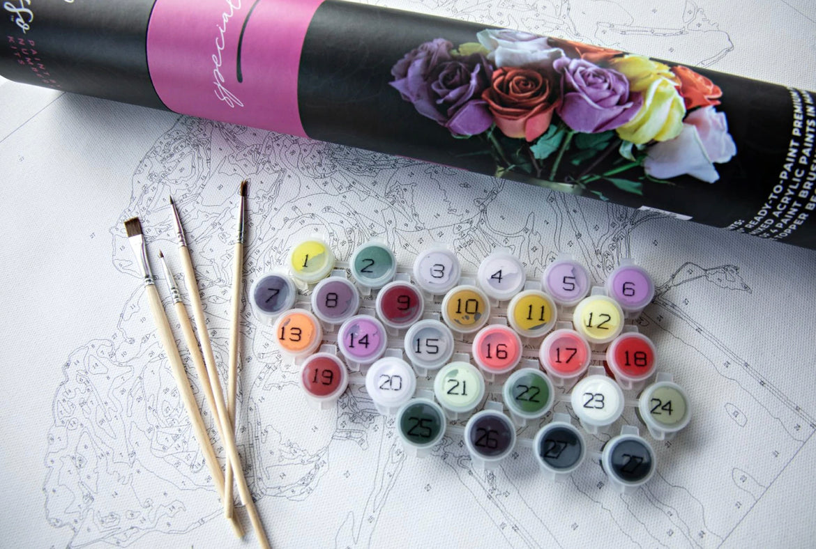 This original image is turned into a unique paint by numbers kit. Each kit includes a great quality template printed canvas, a 4 brush set, handy little pots of acrylic paint, and a map just in case you need to find a number you missed. The Special Edition Kits feature dramatic new black backgrounds that are sure to stun.