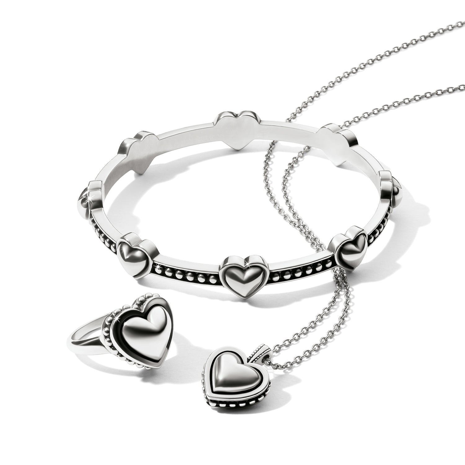 Just like the bold heart necklace in the line, this petite necklace has the exact details but in a reduced size. A shiny silver bulbous heart shape is surrounded by a border of sculpted studding and hangs from a delicate chain.