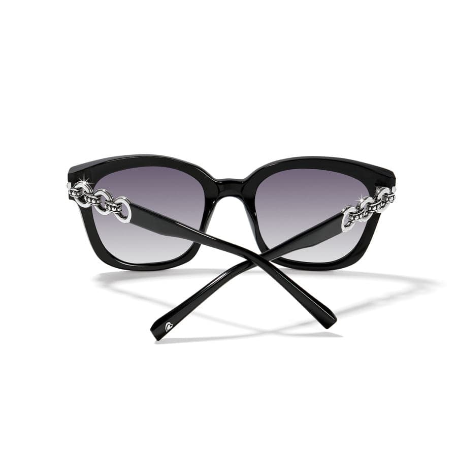This flattering square frame style has a thicker rim - a casual but "fashion" frame. Its temple detail features 3 silver open rings connected by studded links which wrap around the side of the frame to show a little metal detail on the front view. The black frame with gradient lens makes it sophisticated.