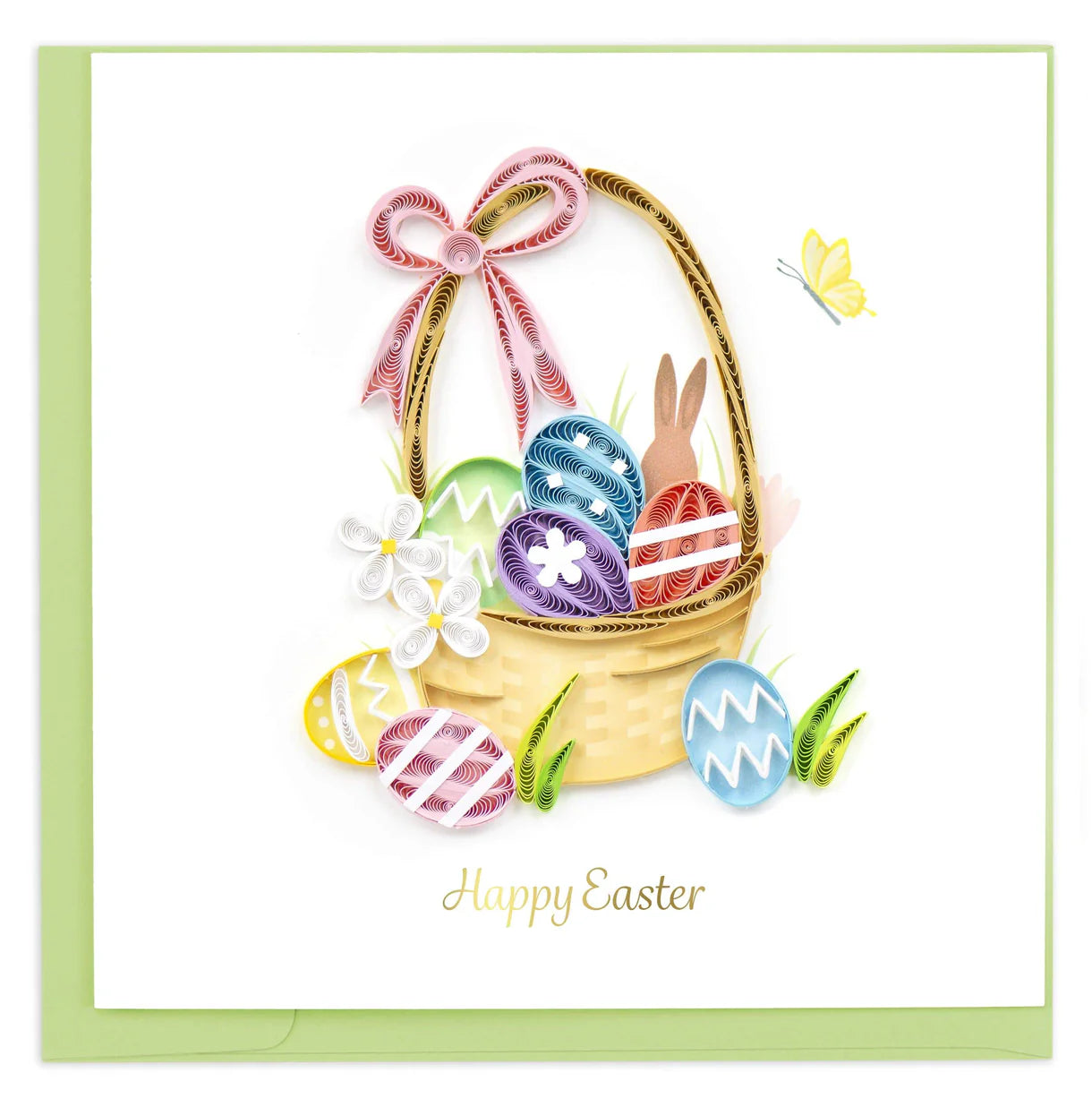 The Quilled Easter Basket Greeting Card is the perfect card to give to a friend or family member on Easter. This design features a tan basket with a pink bow filled with colorful Easter eggs and flowers with some additional eggs in the grass next to the basket. The words Happy Easter are written under the design