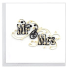 The quilled Mr and Mrs greeting card is a delightful gift for you to give to recognize a couple’s wedding day or to celebrate a relationship. This card says, Mr and Mrs in stylized quilling and has a variety of quilled white, blue, and red swirls and shapes.