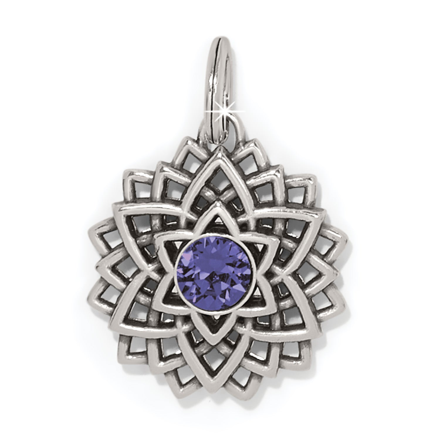 This amulet's design with a fascinating symmetry of silver shapes definitely conveys the feeling of serenity. A colorful fine crystal at the center adds a pop of joyful color.