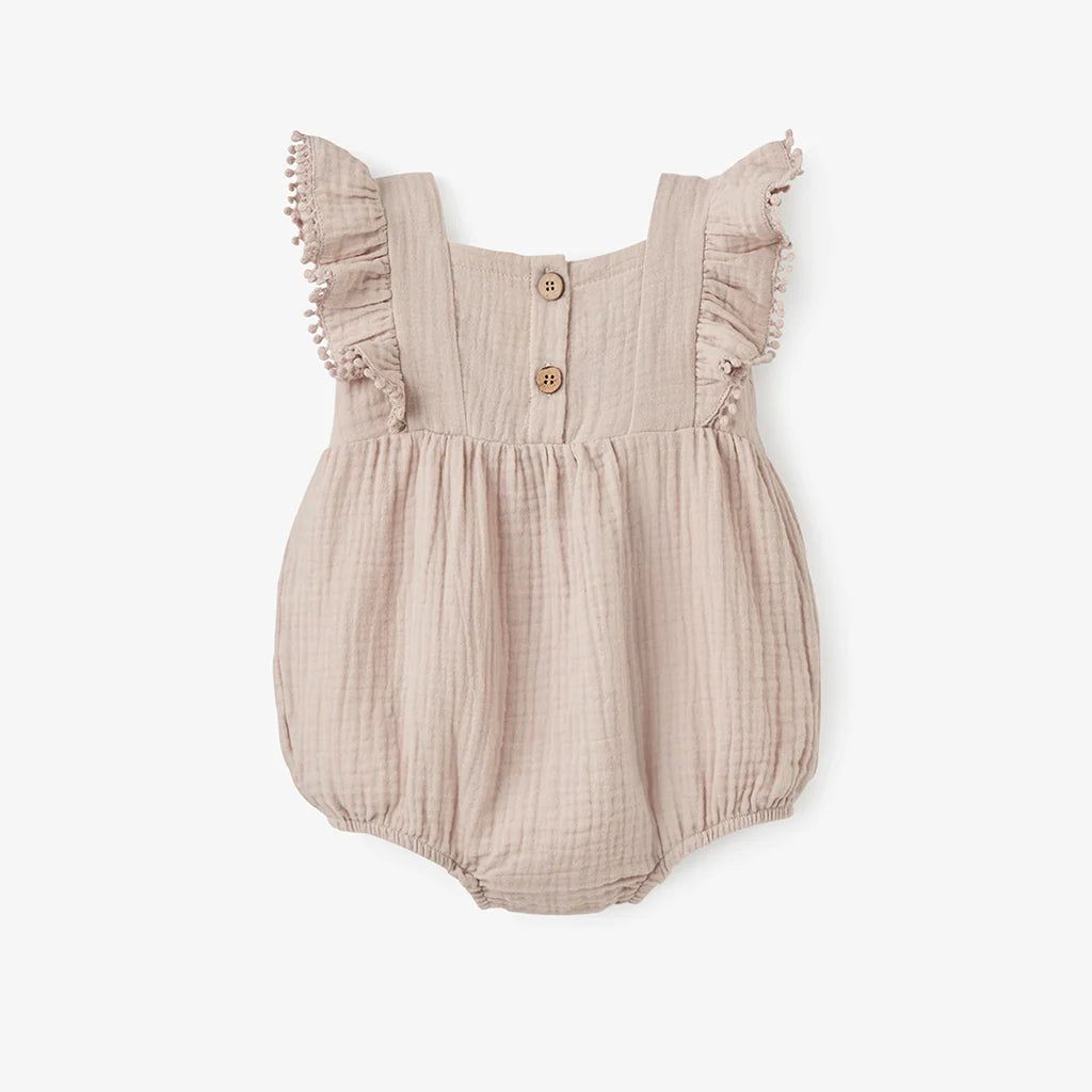 Good for baby, good for the environment. Our organic, naturally sustainable muslin is soft and breathable, ideal for outdoor adventures during the spring and summertime. Cast in a dreamy palette, this muslin baby romper combines fashion and function for the modern child. Floral embroidery and pom-lace adds an extra dash of style and luxury to this already stunning muslin baby romper.