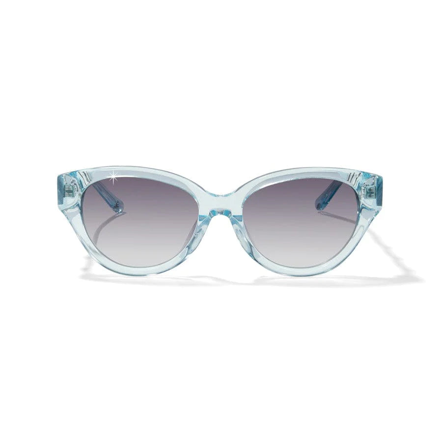 This flattering new shape is an oval with a cat eye feel - super feminine and fun. The temple is a modern and bold link design adorned with the classic "Twinkle" crystal design on the smaller links. Its "Ocean Water" color is a transparent pale blue shade that is soft on the face, easy-on-the-eyes, and super on-trend.