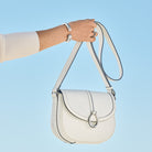 This timeless silhouette is both practical and stylish. It is versatile from day to evening. With the secure flap front and accessible back pocket it makes it a perfect travel companion. The front has bold horse bit style hardware that hangs at end of a bumped center channel. The bag is trimmed with Nappa smooth leather.